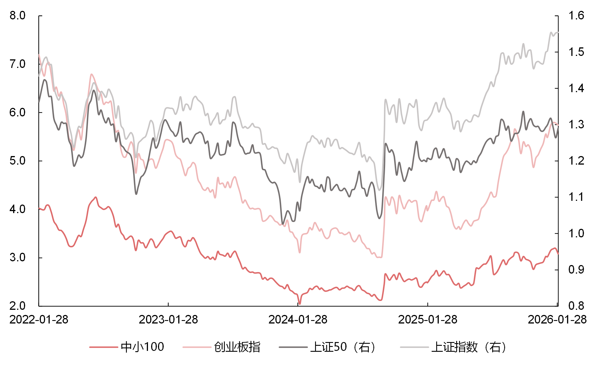 数据来源:Wind,2022.1.28-2026.2.1;左轴为中小100、创业板指的估值水平。