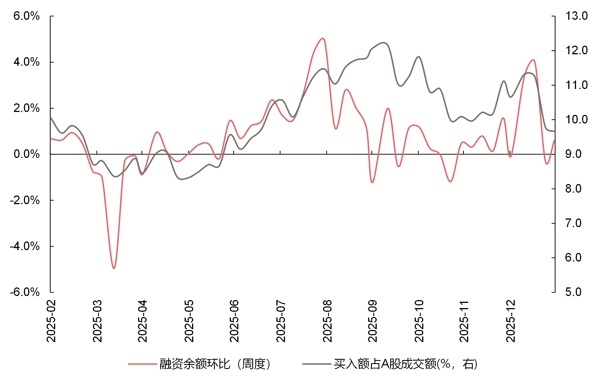 数据来源:Wind,2025.2-2026.1;左轴为融资余额环比(周度)