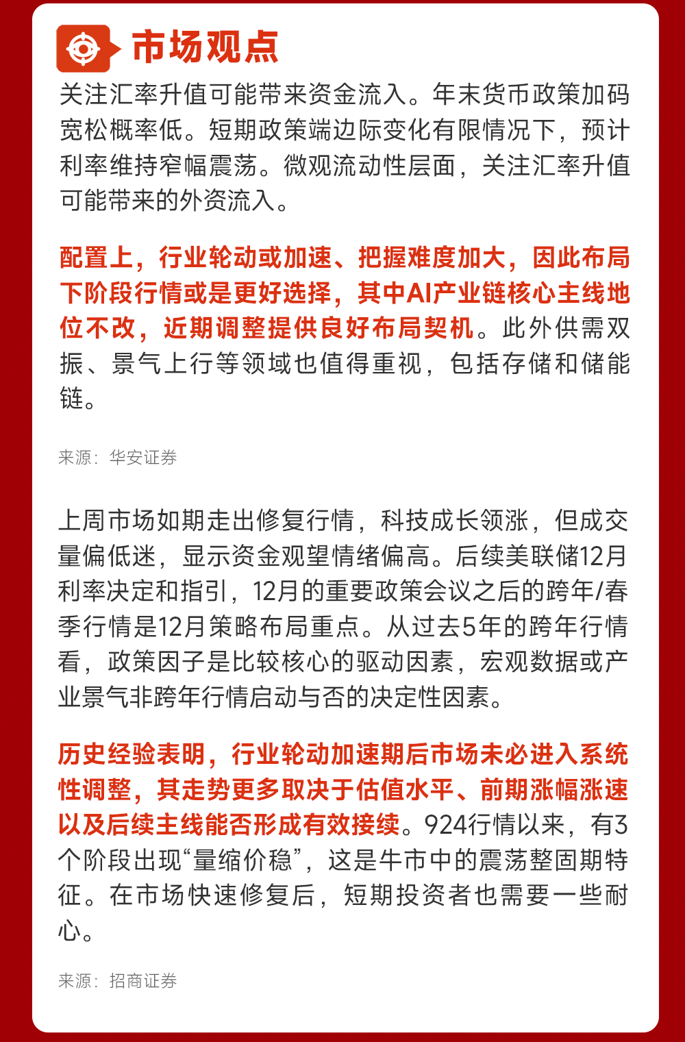 历史经验表明,行业轮动加速期后市场未必进入系统性调整,其走势更多取决于估值水平、前期涨幅涨速以及后续主线能否形成有效接续。924行情以来,有3个阶段出现“量缩价稳”,这是牛市中的震荡整固期特征。在市场快速修复后,短期投资者也需要一些耐心。