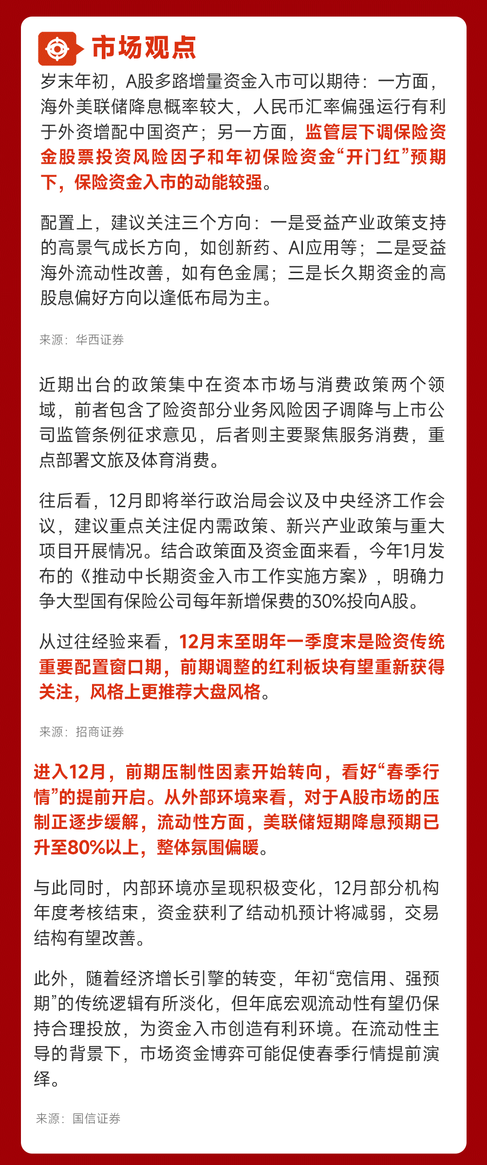 进入12月,前期压制性因素开始转向,看好“春季行情”的提前开启。从外部环境来看,对于A股市场的压制正逐步缓解,流动性方面,美联储短期降息预期已升至80%以上,整体氛围偏暖。