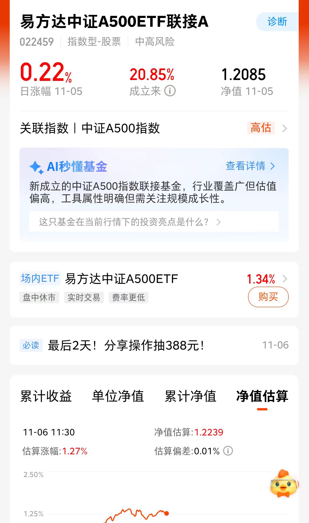 友友们,要临近年底了,小小也比较忙,板块轮动捕捉也有点难度,所以小小今天决定加仓$易方达中证A500ETF联接A(OTCFUND|022459)$对于普通人来收大仓位建议还是上偏成长的均衡型宽基,把握大贝塔,操作来操作去还不如直接买A500或者买沪深300赚的多