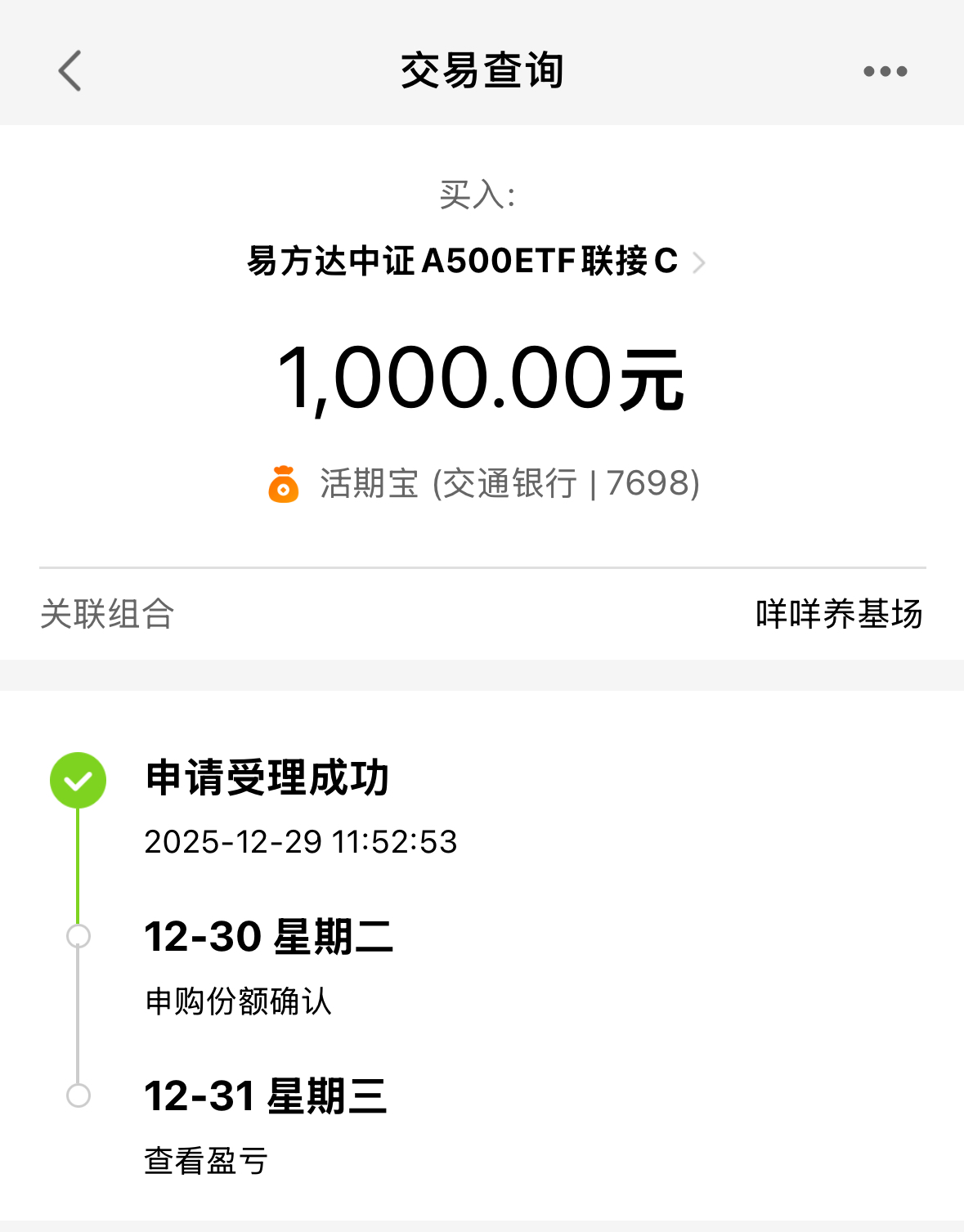跨年行情火力全开,春季躁动更是有提前启动的架势!看着市场热点轮动不停,既怕踏空这波行情,又担心选错赛道白白站岗,这种时候最稳妥的办法,就是用宽基打底做核心配置!我今天直接加仓1000元$易方达中证A500ETF联接C(OTCFUND|022460)$(022460),跟着大资金的脚步走,稳稳拿捏跨年行情。