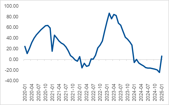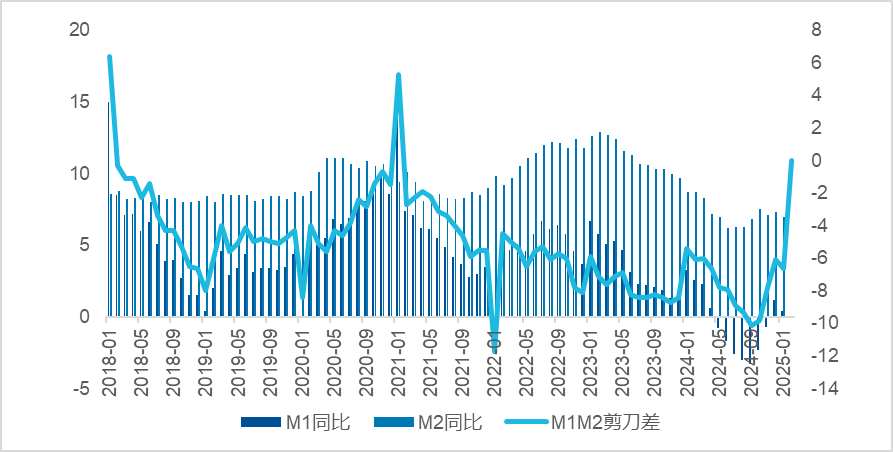 因此,M1-M2的剪刀差往往与企业经济增长预期具有一致性。M1-M2剪刀差自2024年9月上行,至2025年1月行至正区间。