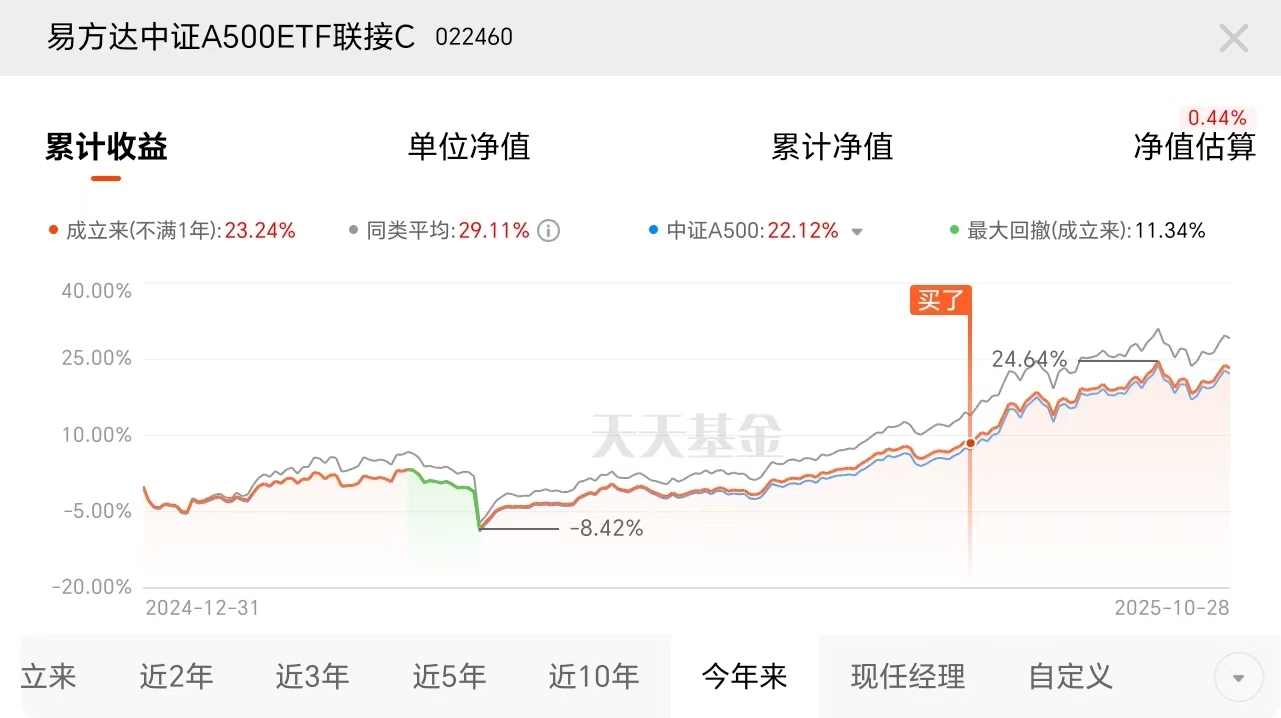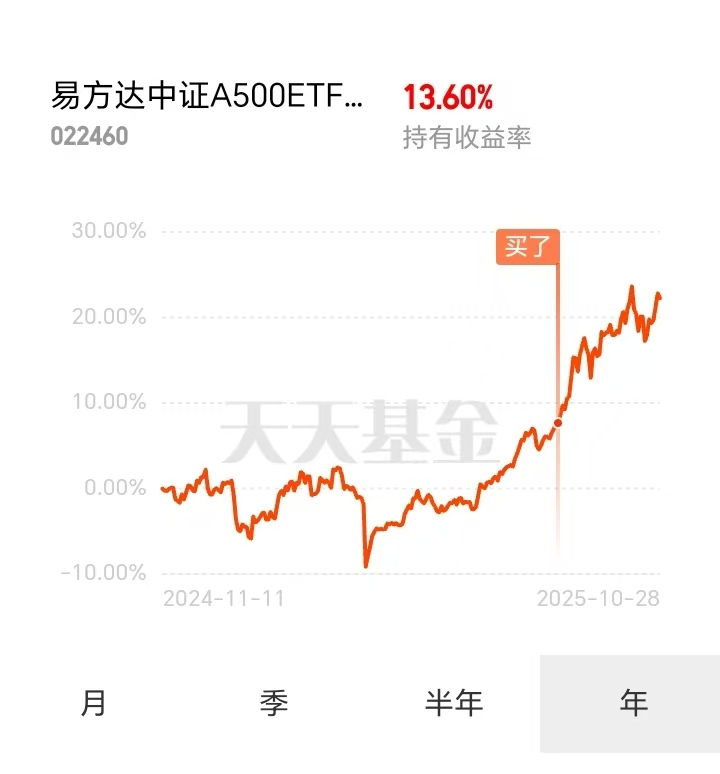 今天A股市场小幅高开了,沪指再度摸到4000点了,慢牛格局挺明显的。而回看今年A股轮动上行的格局,一会儿炒科技一会儿轮周期,我跟着瞎忙活大半年,账户愣是没多大动静。今年以来中证A500都涨22%了,想起当初买的$易方达中证A500ETF联接C(OTCFUND|022460)$。现在一看这基今年以来也涨了23.24%,跑赢指数不说,连我中途上车的持仓收益率都13.6%了,真是得拍大腿啊,早知道不瞎操作,买它躺平多省心呀!#慢慢投基路 你悟出了哪些投资哲学?#