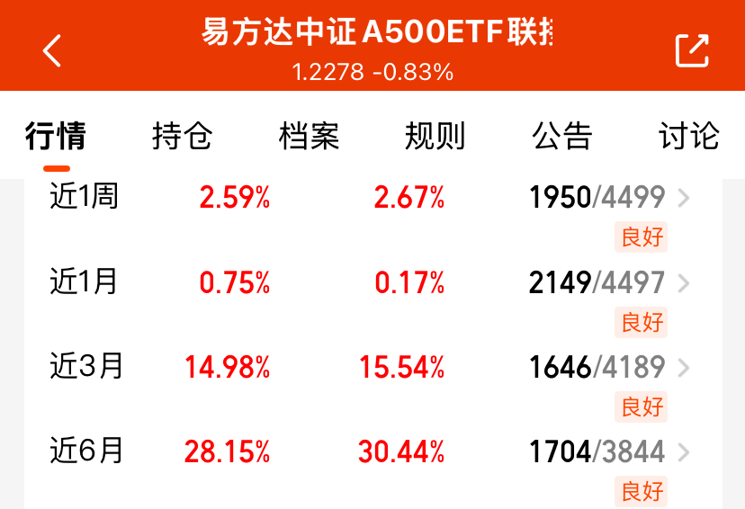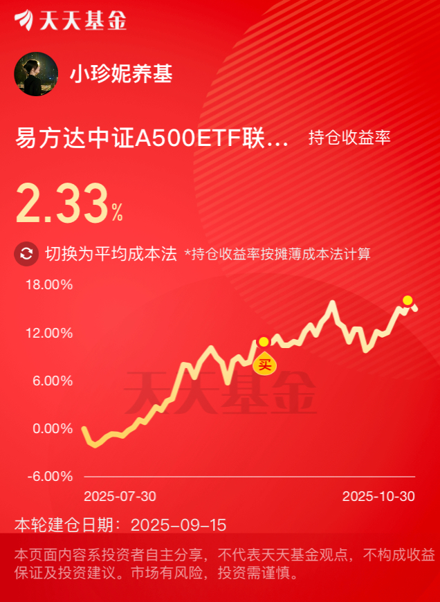今天虽然大盘有所调整,但是随着沪指再创新高,行业热点不断的切换,我准备布局一波A500$易方达中证A500ETF联接C(OTCFUND|022460)$,把它当作底仓配置,跟随行情走势,期待后续带我吃肉呀!#能源金属概念狂飙!锂电大周期来了?##美联储再次降息!12月降息与否难料#0$海富通沪深300指数增强C(OTCFUND|004512)$$易方达沪深300量化增强(OTCFUND|110030)$