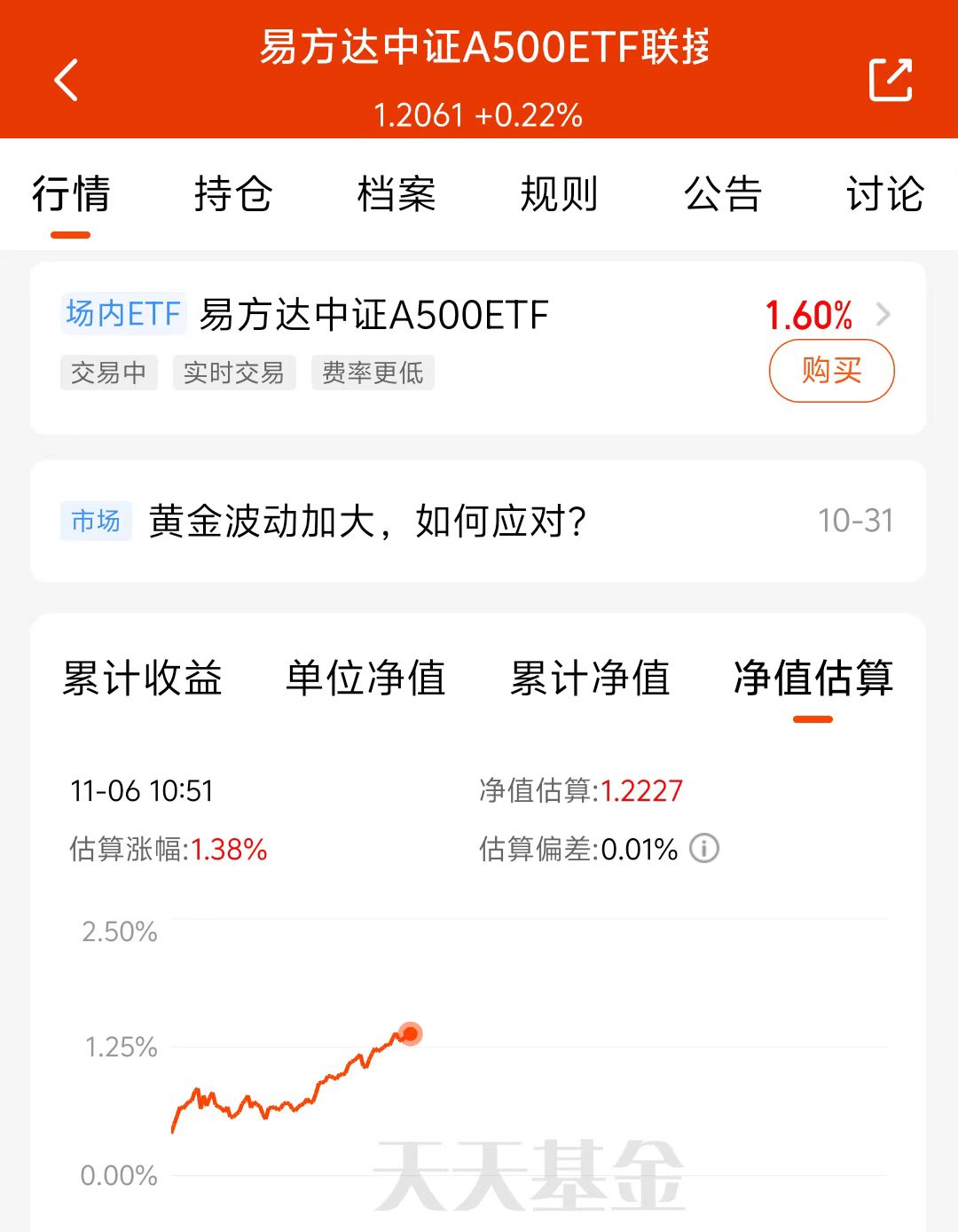 昨日市场低开高走,今日早盘市场继续走高,终于让人缓口气,最近的市场就像孩子的脸红一天绿一天,我感觉现在压单一板块的难度比较大,与其操作来操作去不如多看看宽基,今年做为科技年,所以我比较看好A500方向,我持有的$易方达中证A500ETF联接C$ 022460跟踪的是A500指数,涵盖了新能源、人工智能、创新药等多个赛道,持仓均衡,不压单一板块,让人更安心,截止当前估值上涨1.38%,长期持有中!