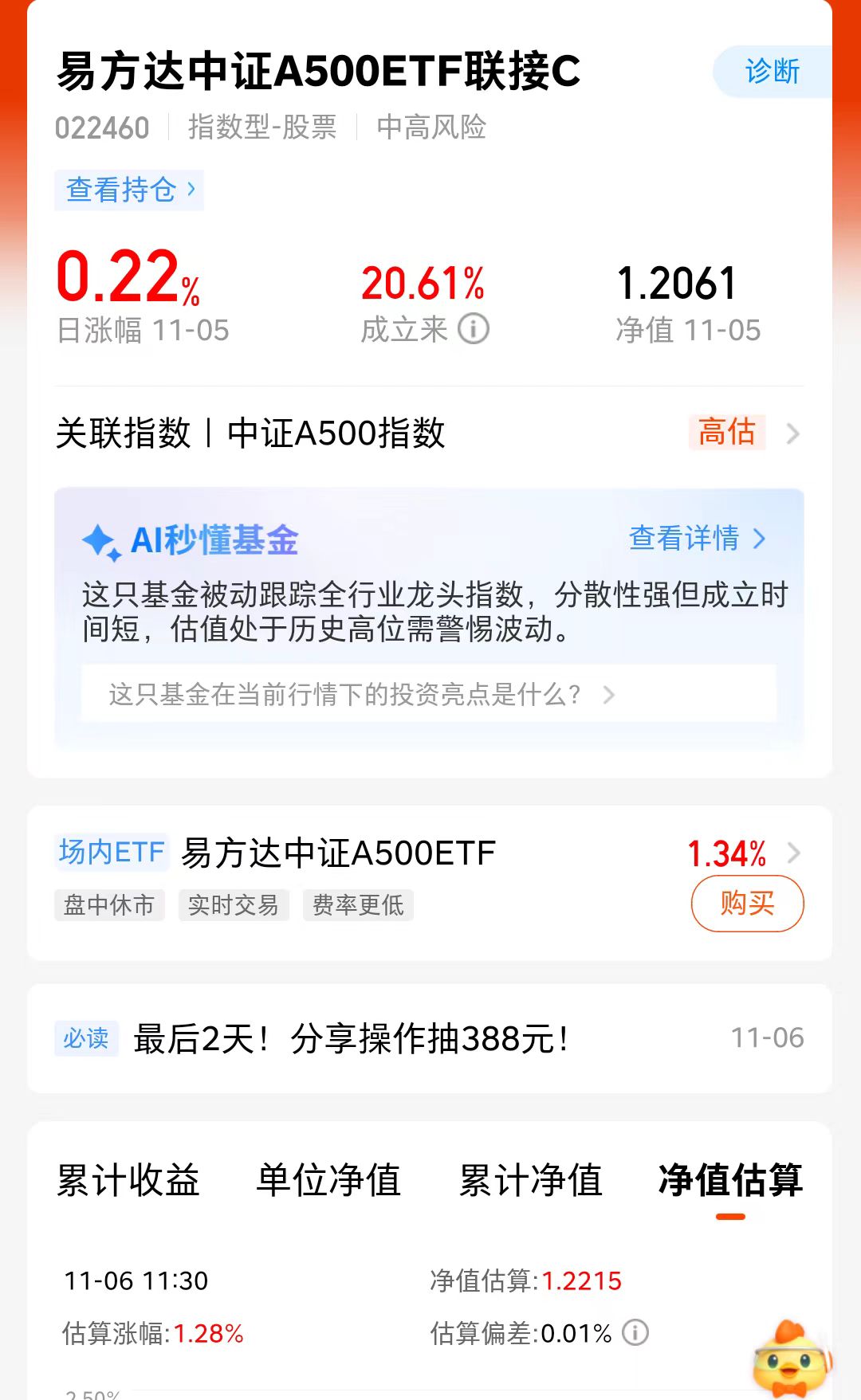 最近股市行情偏震荡,波动大。作为普通人的我还是觉得大仓位要选偏成长的均衡型宽基,把握大贝塔,操作来操作去还不如直接买A500或者买沪深300赚的多。我觉得$易方达中证A500ETF联接C(OTCFUND|022460)$就不错,成立以来已经上涨20.61%,业绩不错。