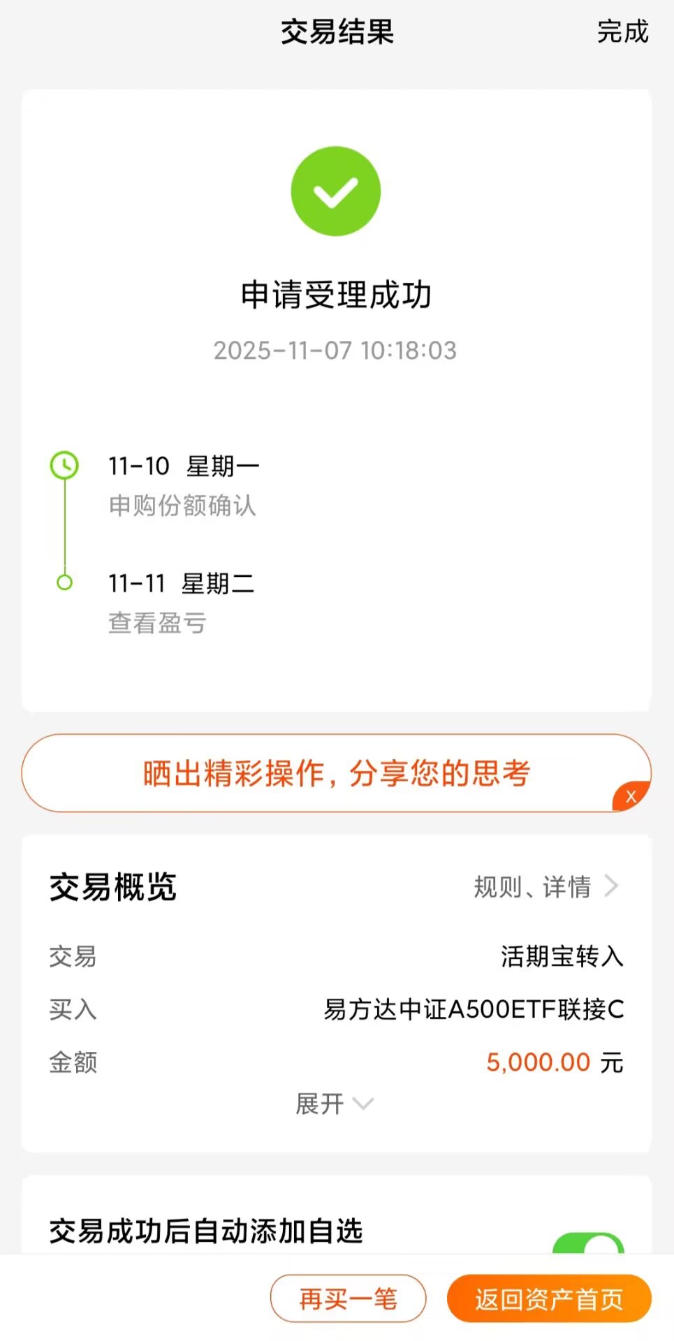 加仓5000元$易方达中证A500ETF联接C(OTCFUND|022460)$,该基金紧密跟踪中证A500指数,覆盖A股全部中证一级行业及90多个三级行业,几乎实现行业全覆盖,这样的宽基指数有一个好处,那就是可以分散风险,容易判断方向, 大盘涨它就会涨,不用过多关注板块之间的轮动,而当前的实际情况就是A股牛市比较确定,大盘在4000点附近波动加大,板块轮动比较快,多数人很难踏准市场节奏,弄不好在牛市里还会亏钱,因此配置宽基指数还是非常省心且确定的的做法。