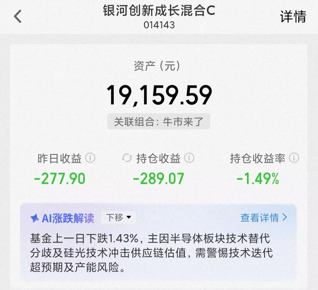 半导体持仓待涨 科技在昨天回调后今天继续震荡修复,我也配置的有科技相关基金,在最近我持续布局了$银河创新成长混合C(OTCFUND|014143)$这只基金,我一共买了20000块,目前小亏几百块钱,在组合中的持仓收益率-1.49%。虽然这两天表现一般,但我认为这只不过是牛市中的正常回调,我继续看好科技,相信收益很快就会转正盈利,我已经将其加入我的实盘组合:牛市来了,大家和我一起见证。当初买这只基金就是看中了它的高弹性,在牛市中涨得快,我们看该基金多季度重仓半导体、算力龙头个股,比如说中芯国际、兆易创新、寒武纪、海光信息等。这些个股科技成长属性比较高,弹性比较大,更容易得到资金的追捧,到目前为止,今年累计涨幅45%,表现十分优秀。