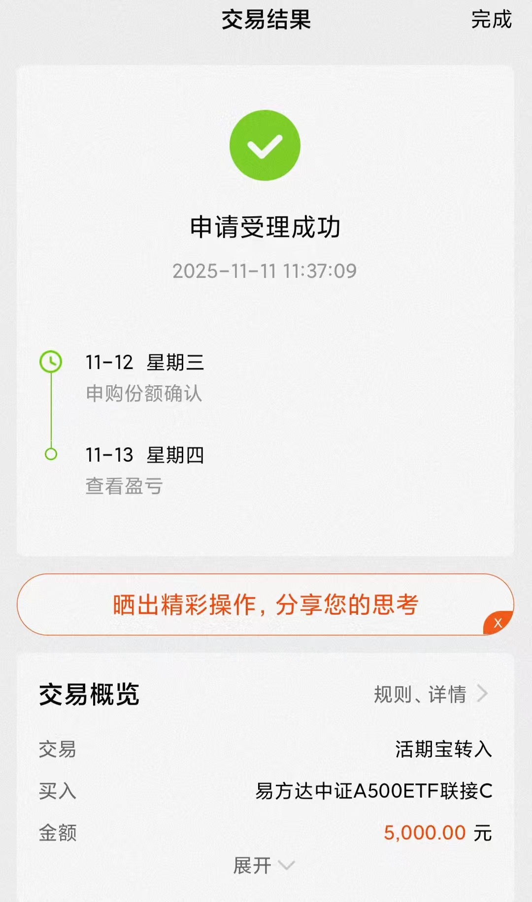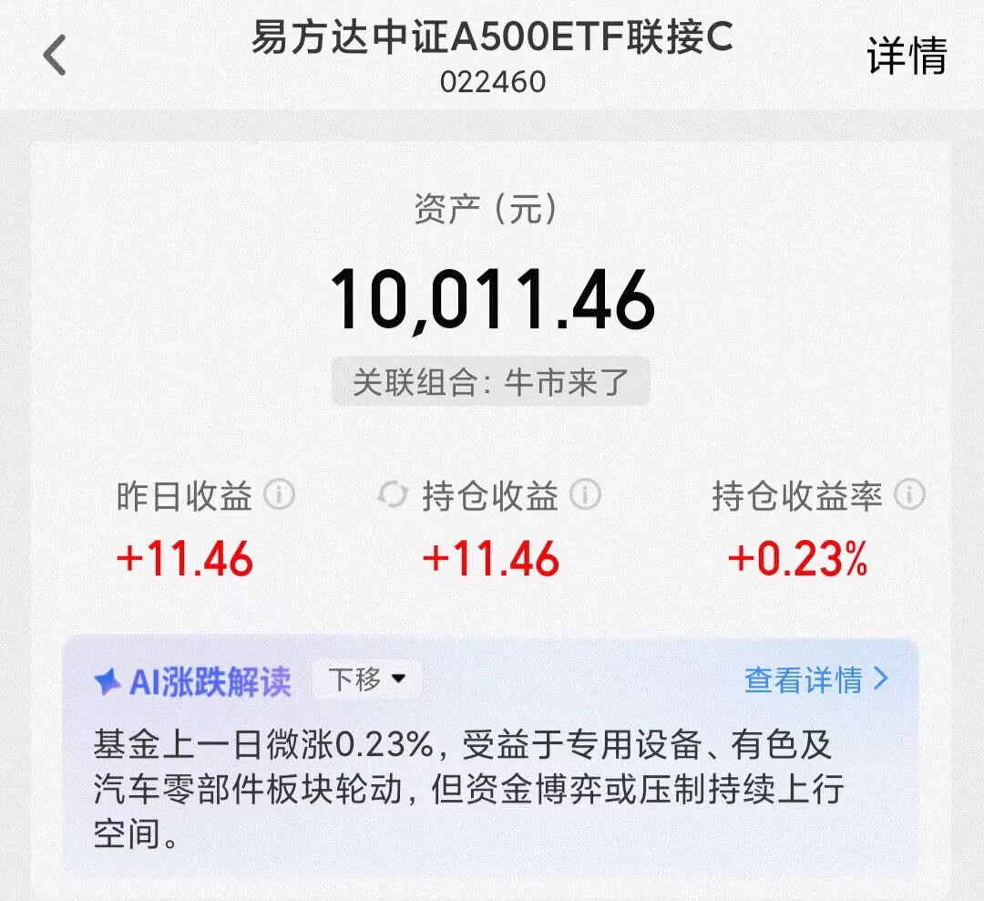 并且该指数中新能源、电子等行业表现突出,与当前经济转型方向契合,相对沪深300指数弹性更大,在牛市中表现也更亮眼,今年以来累计上涨23.41%,明显超过沪深300年度涨幅,多阶段表现优秀,当前A股处于牛市中震荡修复阶段,修复过后大概率仍将继续上行,而A500与大盘走势一致,因此非常省心且确定,在上周我就已经配置了一些,今天大盘再次回撤,我感觉仍是机会,我决定继续追加5000元增大仓位。