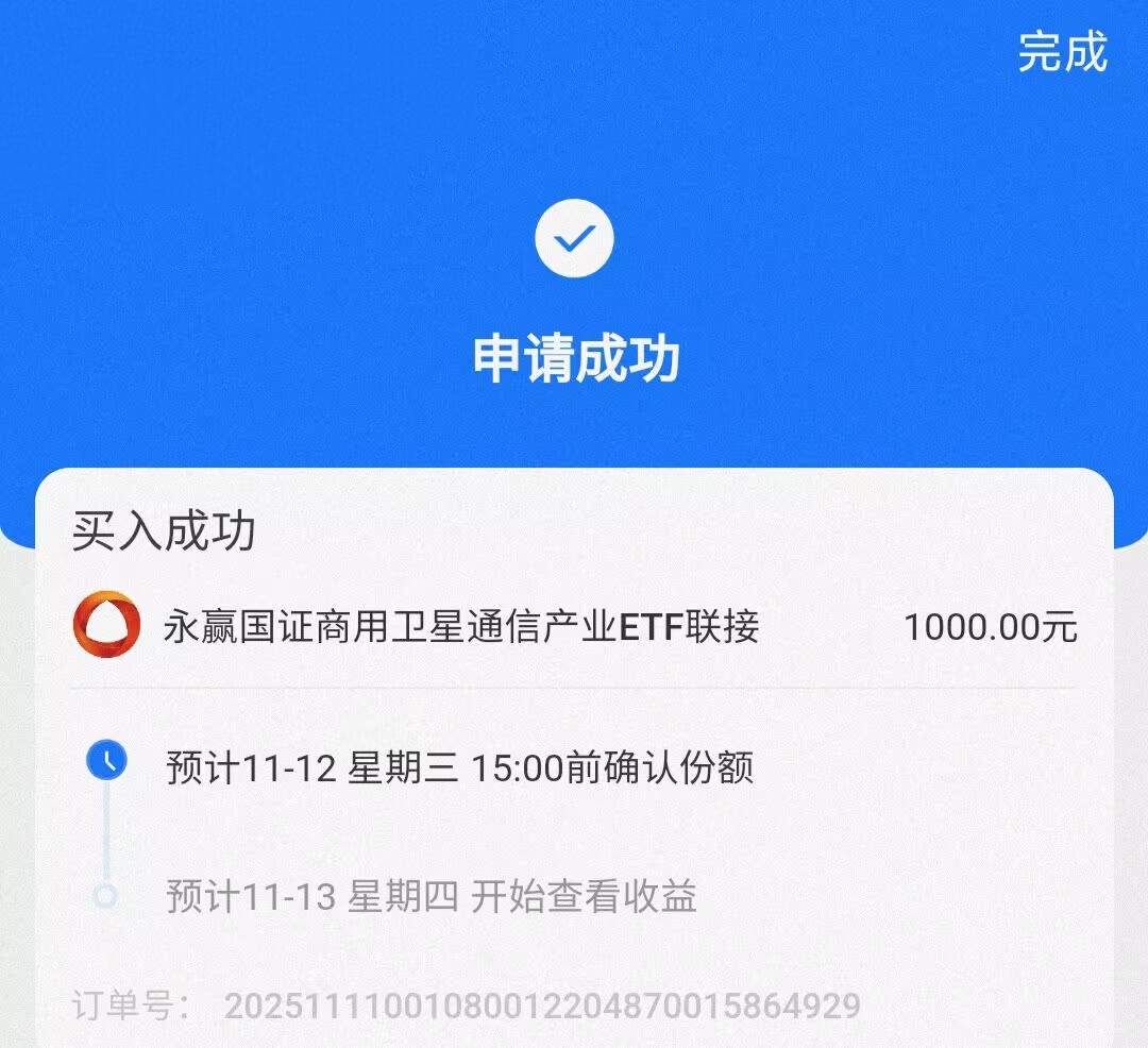今日买入1000元 $永赢国证商用卫星通信产业ETF发起联接C(OTCFUND|024195)$,卫星通信已经被纳入新质生产力核心领域,尤其是在近期对于卫星通信的利好拼出,带来较多催化,十五五规划提及商业航天,把飞天的成本打下来,让卫星服务像手机一样普及,国务院办公厅新近出台意见明确推动卫星服务应用场景,同时,四川国星宇航在乌镇峰会首发全球最强太空算力星座计划,可以说发展进入到快车道,机会比较多,而该基金紧密跟踪卫星通信指数,覆盖商用卫星制造、通信设备、应用服务等产业链环节,基本上一键打包卫星通信相关公司,可以帮助我们捕捉卫星通信发展带来的红利,在之前我已经入手,今天大盘回调,我感觉机会又来了,决定继续加仓1000元增大仓位。