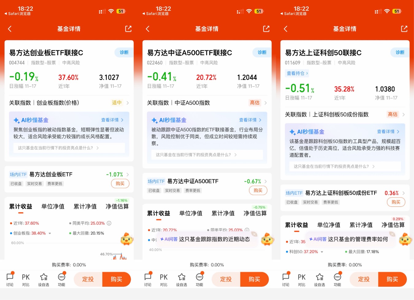 2. 指数类:我配置了50%仓位,这一部分主要配置沪深300 + 中证500 + 标普500 + 纳斯达克100这样的中美核心宽基指数基金,以求可以跟上市场平均涨幅。
