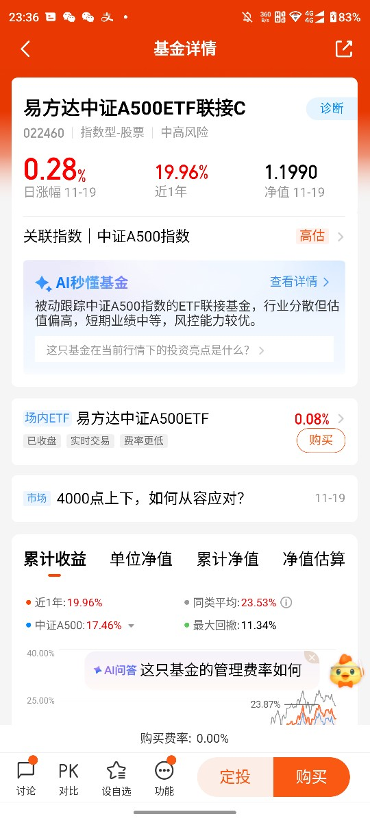 我手里的易方达中证A500ETF联接C,选它就是看中中证A500的“实在”——覆盖各行各业的龙头股,行业分布均匀,不会因单一板块涨跌慌神,还聚焦新兴产业,贴合经济长期趋势。而且4000点以下从来不是A股的长期状态,就像超市打折,此时买入相当于摊低成本,性价比更高。