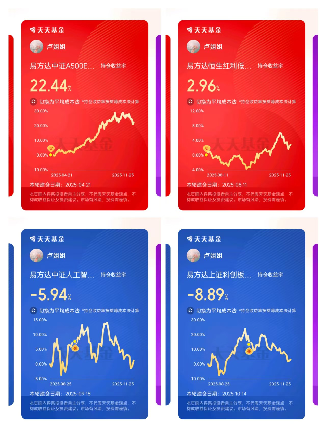 如今,承载着众多期许的易方达中证A500ETF联接基金( C:022460)2025年即将完美收官,其表现可圈可点,11月21日上周五市场放量下跌,它的稳健优势显现出来,才跌2.59%,很多公益类基金动辙跌5%以上;该基金也即将正式踏上2026年财富新征程,带给我们持有人稳稳的幸福!拿它来作为我们资产配置底仓,既可以享受到中国经济发展的红利,又能在行业轮动飞快的资本市场中应对自如,近期市场4000点的连续震荡,反而给这只基金创造了难得的抄底机会,我持有这只基金赢利了22.44%,我会继续坚持定投,静待花开!@易方达基金
