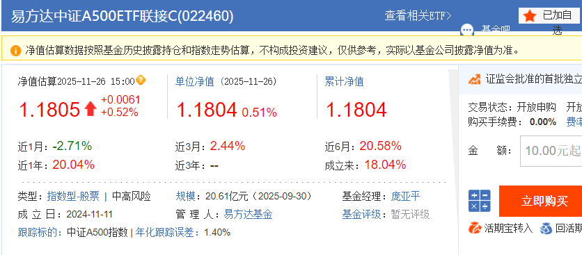 近期走势强劲:2025 年 7 月以来,中证 A500 进入平稳上涨区间,截至 11 月 26 日收盘达 5,422.52 点,较 7 月初低点上涨约 12%,同期跑赢上证 50、中证 800 等宽基指数。这一表现与其超配的电子(半导体)、基础化工(新材料)等热点板块密切相关。