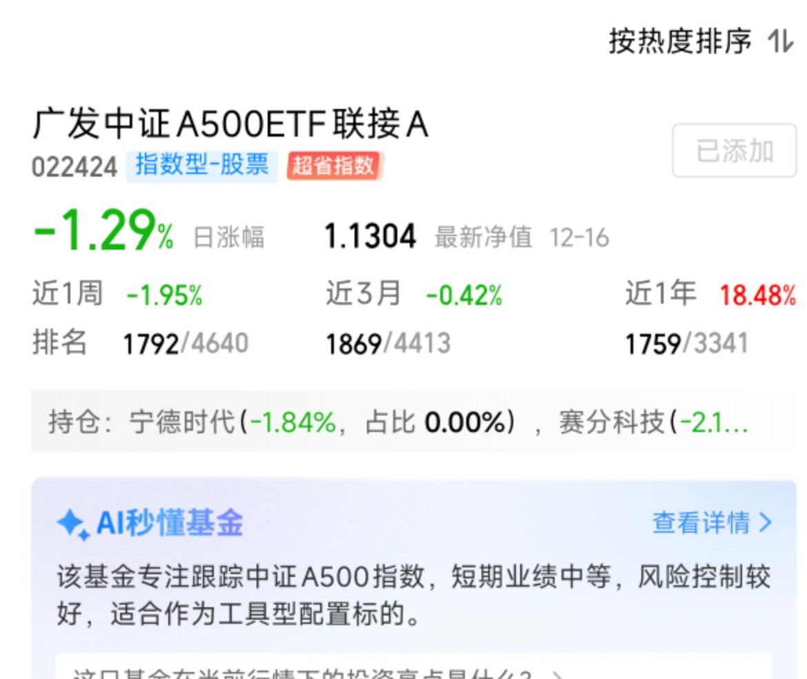 这个和我买的这个广发A500近一年收益,都差不多,但是广发这个A份额最近不要申购费了,你们知道吗,会更划算一点$广发中证A500ETF联接A$