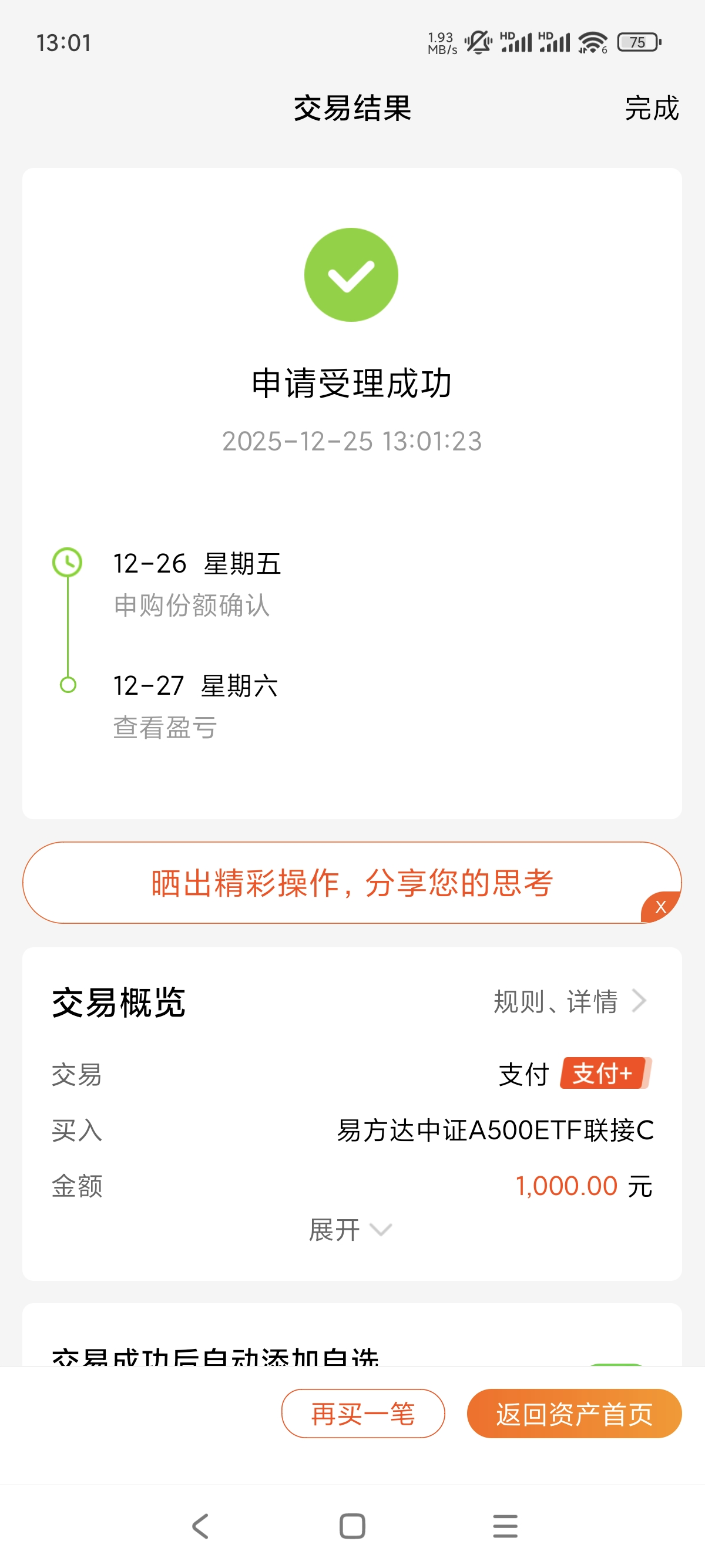 春躁行情下,无需纠结择时选股,完全可借道易方达中证A500ETF联接C(022460),布局500只细分龙头,兼顾成长红利与波动抵御,牛犇先买入1000元份额。$易方达中证A500ETF联接C(OTCFUND|022460)$