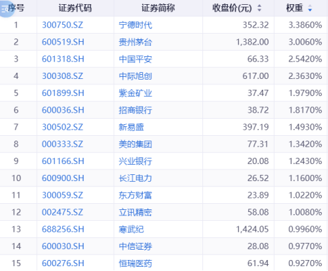 从最新数据看,当前指数的前十五大重仓股包括宁德时代、贵州茅台、中国平安、中际旭创、紫荆矿业等龙头股,不少都是当前市场比较喜欢的。