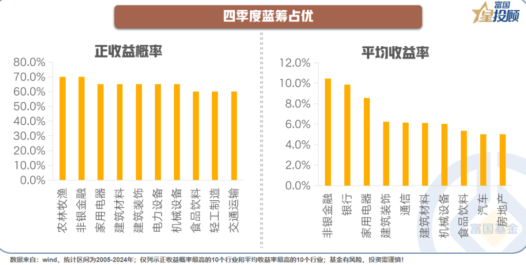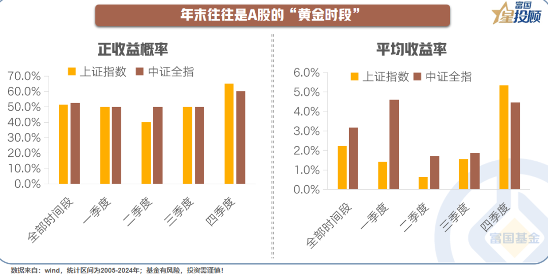 从历史经验来看,年末往往是A股的“黄金时段”。2005-2024年,上证指数和中证全指在四季度获得正收益的概率分别为65.0%和60.0%,明显高于全时间段的51.3%和52.5%;平均收益率分别为5.53%和4.46%,同样明显高于全时间段的2.23%和3.16%。
