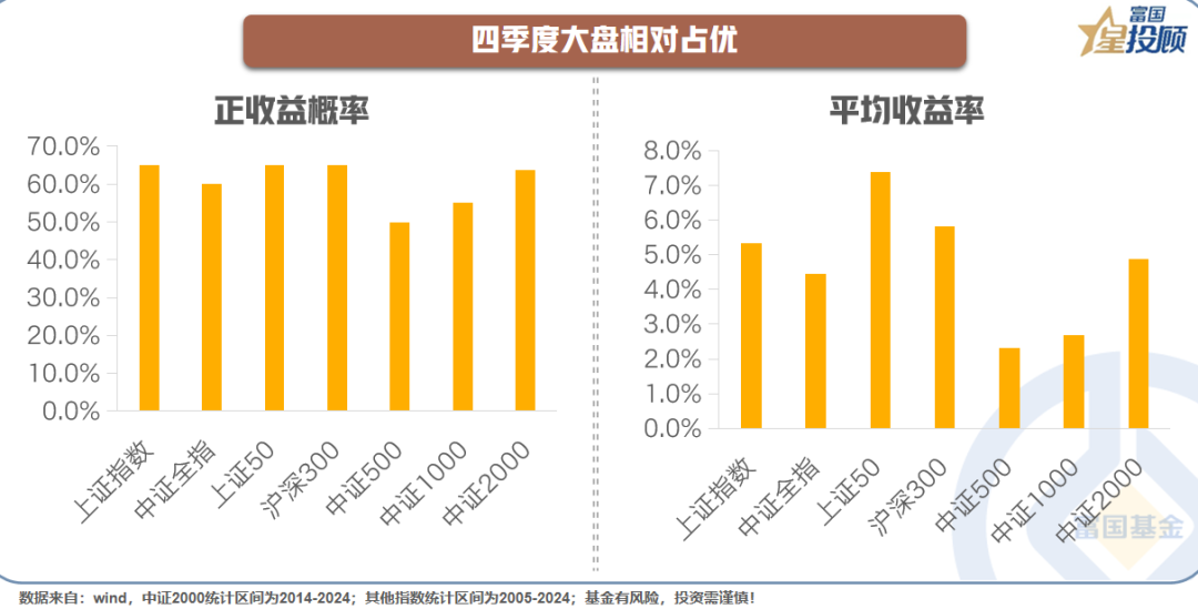 从市值风格来看,过去20年的数据显示,在年末行情的演绎过程中,大盘整体要好于中小盘。具体而言,上证50在四季度获得正收益的概率达到65.0%,平均收益率高达7.4%,要明显好于中证500(代表中盘)和中证1000(代表中小盘)。中证2000(代表小盘)的基日为2013年12月31日,距今不满20年,其表现也不如上证50。