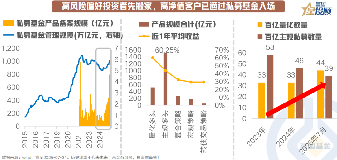 由于居民内部风险偏好的差异,存款搬家的表现也存在分化。其中,高净值客户的风险偏好通常显著高于普通投资者,因此往往率先入市。具体来看,目前高净值客户已出现较为明显的通过私募基金参与权益市场的趋势。自2024年9月以来,私募基金的管理规模与产品备案数量均呈现加速增长。从结构上看,量化私募凭借业绩表现优于主动管理产品,对高净值客户的吸引力更强,资金正在加速流向量化赛道,截至2025年7月,百亿私募中的量化私募数量较2024年底增加了11家,而主观私募则减少了7家。