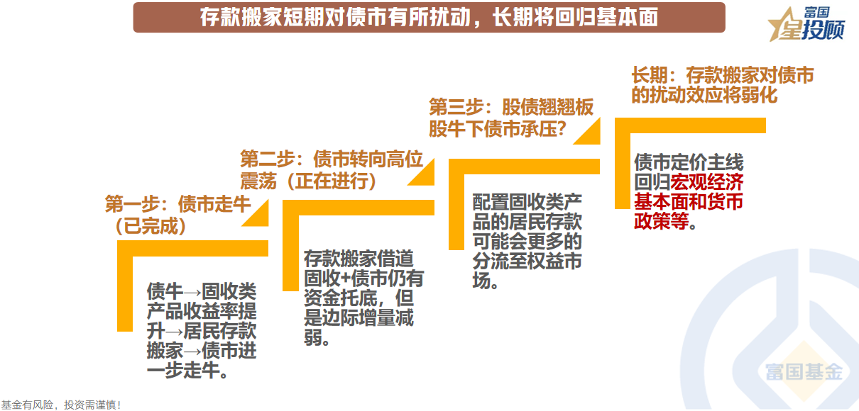 存款搬家对债市的影响可分阶段来看:第一步(已完成),2024年债牛带动固收类产品收益率提升,居民存款大量流向纯债基金、银行理财及保险等以债券为底层资产的产品,增量资金直接转化为配债力量,形成债市走牛的正反馈机制;第二步(正在进行),低风险资产收益率低迷,难以满足居民的收益需求,居民资金通过“固收+”间接入市,债市仍有托底资金,但边际增量趋弱,债市特征转为高位震荡;第三阶段,若股市赚钱效应持续累积,配置固收类产品的居民存款可能会更多的分流至权益市场,对于债市造成一定的压力。但从长期视角来看,存款搬家对债市的扰动效应将弱化,债市的长期定价主线仍取决于宏观经济基本面及货币政策等。