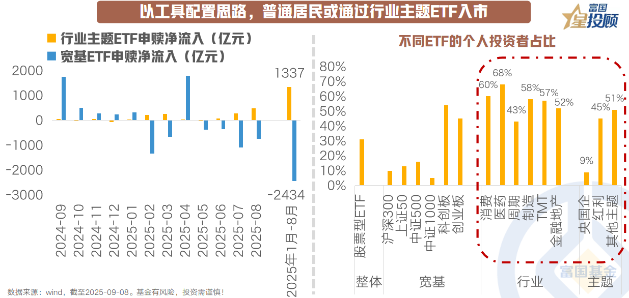 3)“固收+“基金方面,2022年后由于股市的低迷,”固收+“基金持有A股的市值大幅度下降,2025有一定的回升迹象,但是仍然处于相对低位。若回到上轮牛市2021年时的水平,”固收+“基金的权益仓位潜在增量约1900亿元。从重仓行业来看,”固收+”基金偏好银行、有色、公用事业、交运、煤炭、化工等红利和顺周期行业,对相关板块形成边际支撑。4)行业主题ETF方面,个人投资者偏好集中于科技与金融主题,资金流入或将支撑相关板块并强化A股结构性行情。受益于ETF的被动指数属性,资金将进一步向龙头企业集中,凸显行业龙头效应;同时,其配置特征有助于降低个人投资者短期个股交易频率,平抑市场波动,推动慢牛格局演绎。