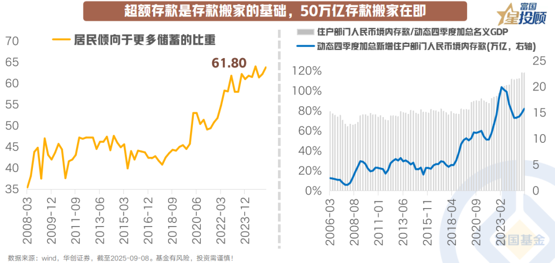 因此,在缺乏具有吸引力的替代投资渠道,同时后疫情时期经济与收入预期不确定性上升的情况下,居民风险偏好回落,预防性储蓄意愿显著增强。央行调查显示,2022年末倾向“更多储蓄”的居民比例超过60%。在此背景下,大量超额存款得以形成。根据华创证券测算,以疫情前居民存款占GDP比重约80%的情况作为常态水平,2024年底我国名义GDP约135万亿元,对应正常存款规模约110万亿元,而实际居民存款接近160万亿元,意味着大概形成了约50万亿元的超额存款,可以作为居民未来存款搬家的基础。