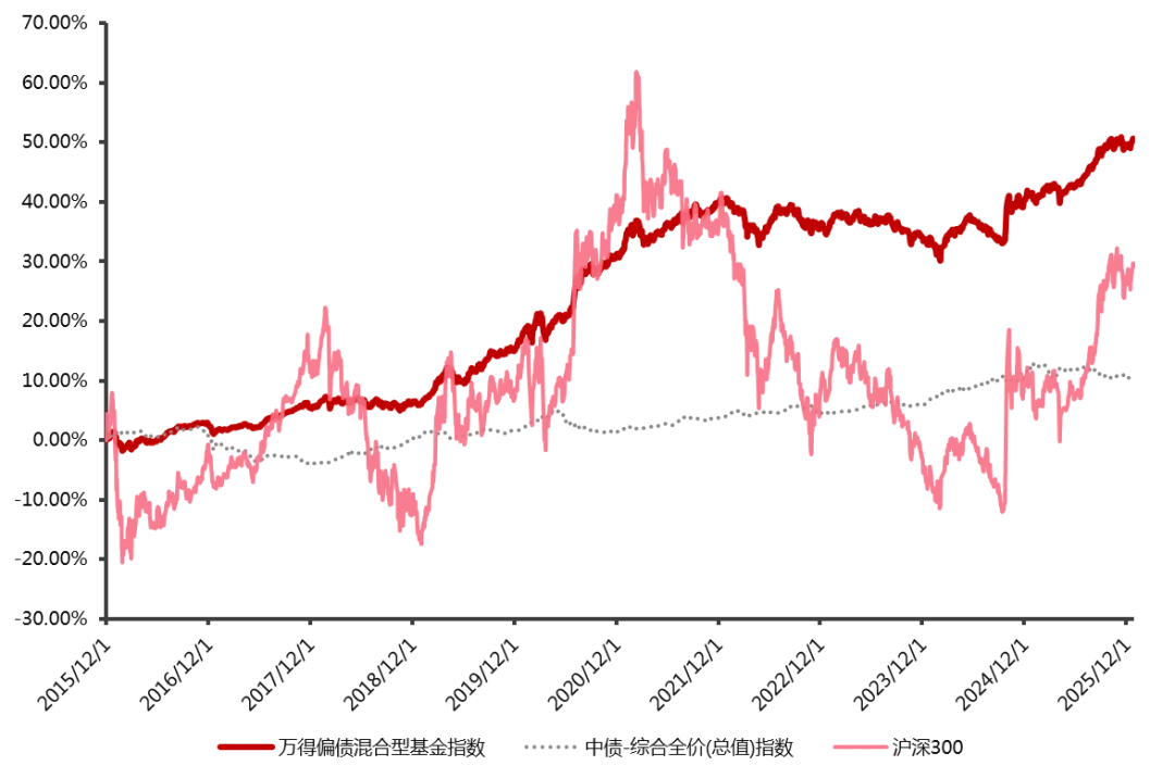 作为“固收+”典型代表指数之一的偏债混合型基金指数在近年震荡的行情中表现突出,配置价值逐渐被市场认可。Wind数据显示,截至2025年12月1日,过去十年(2015.12.1-2025.12.1)偏债混合型基金指数(885003)上涨了49.62%,对比中债-综合全价(总值)指数以及沪深300指数有较明显的长期收益优势。在波动率方面,偏债混合型基金指数波动率为3.66 %,大幅低于沪深300指数18.33%的水平,实现了“低回撤+稳回报”的良好走势。