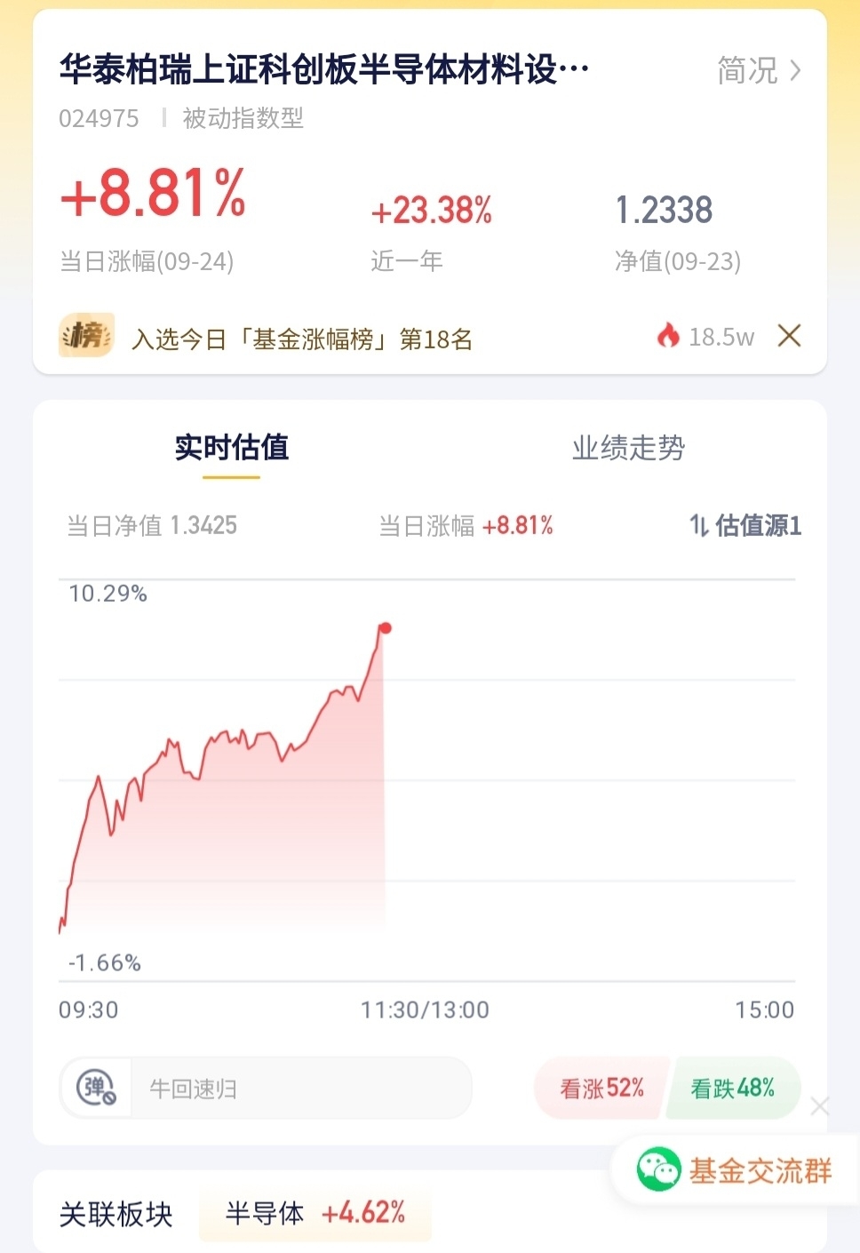 科创半导体设备这势头挡不住,半个月基本在涨,就两天小回调。昨天大涨3.5%,今天开盘又4个点,国产替代关键环节果然给力,中芯、华为突破不断。我准备留意华泰柏瑞,借道参与这波行情更稳妥。