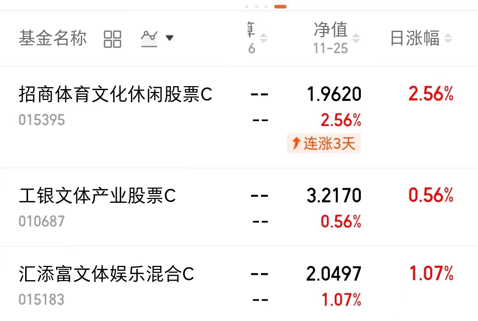 友友们,这周股市行情反弹,游戏传媒板块变现亮眼。$招商体育文化休闲股票C(OTCFUND|015395)$昨天又上涨2.56%,接连上涨啊。最近行情不错,可以关注一下这个赛道。