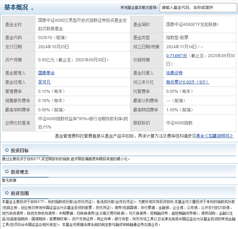 该基金有完善的投资策略保障运作稳定。投资中投资于目标 ETF 的比例不低于基金资产净值的 90%,同时会根据标的指数成份股变动定期调整组合,特殊情况下也会通过合理替换股票等方式保障组合贴合指数走势。其目标是力争净值增长率与业绩比较基准之间的日均跟踪偏离度绝对值不超过 0.35%,年跟踪误差不超过 4%,成熟的运作策略能帮助投资者较好地获取中证 A500 指数的整体收益,减少跟踪偏差带来的风险。