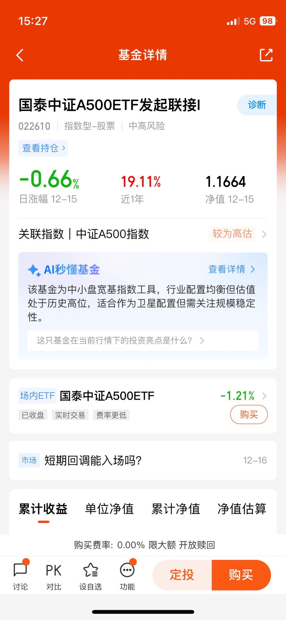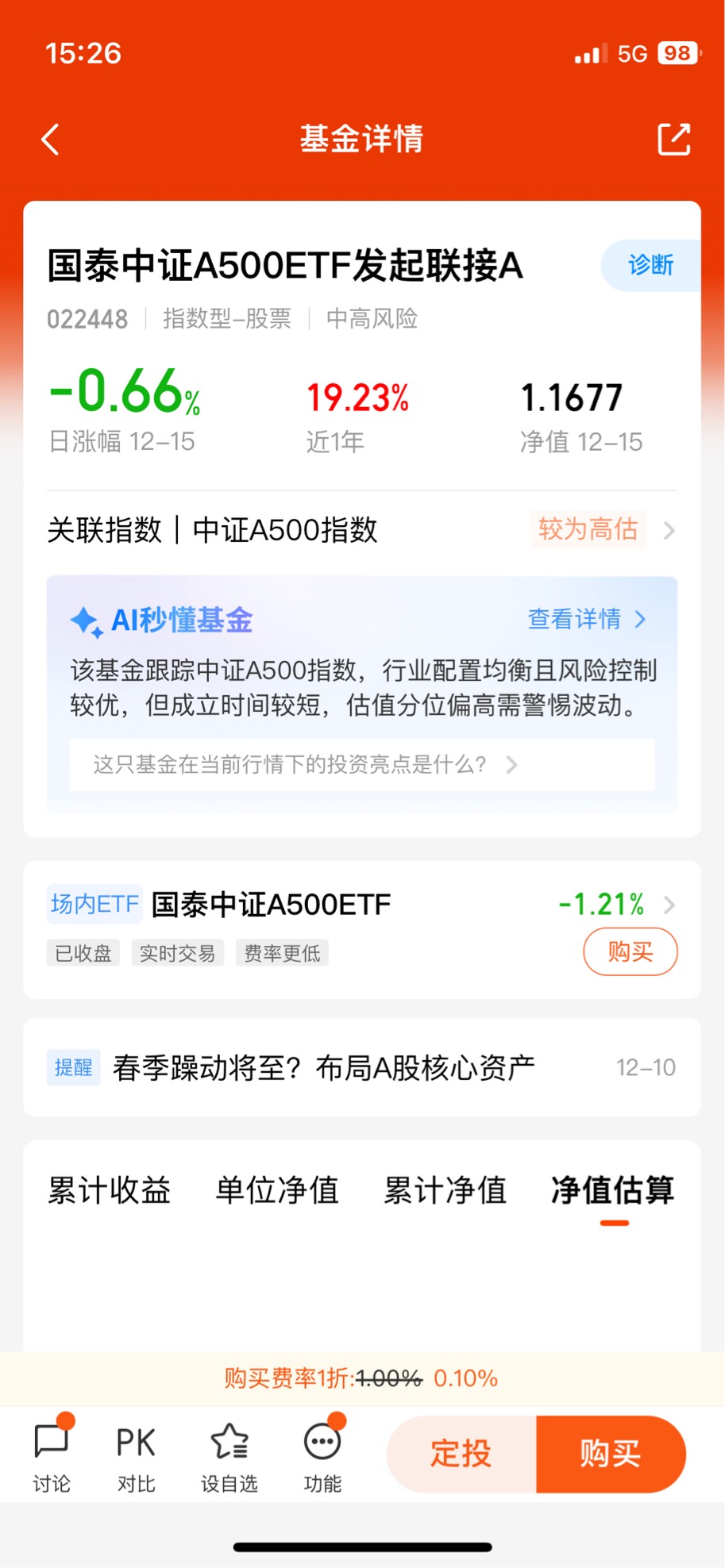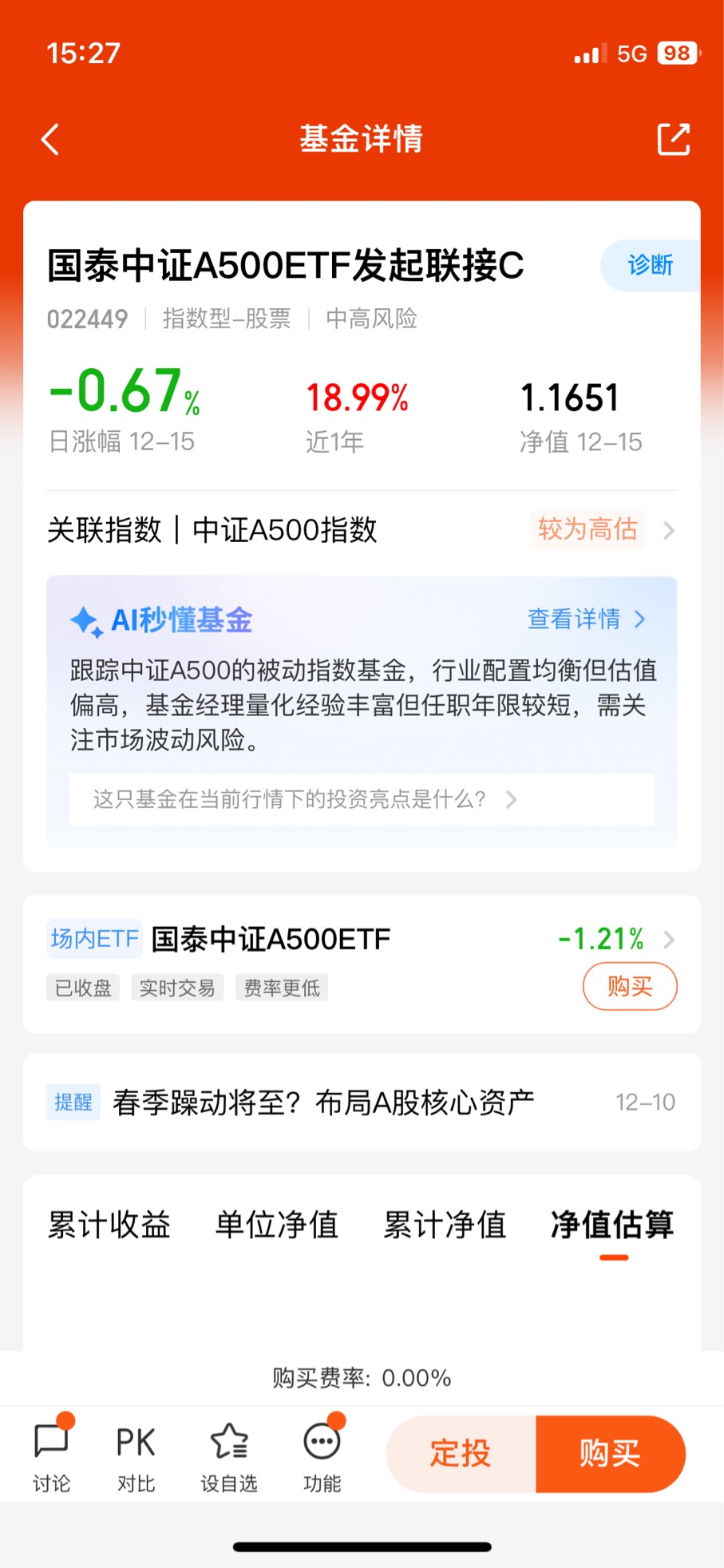 国泰中证A500ETF联接就是被动跟随中证A500指数的场外ETF基金。今年的投资回报超过20%,与此同时,在指数低费率的基础上,又多增加了两条费率让利条款:全市场最低档的销售服务费和七天免赎回费。