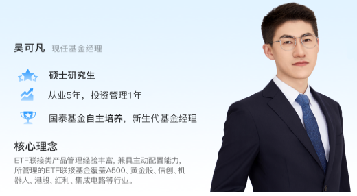 基金经理吴可凡先生是硕士学历,2019年就加入了国泰基金,从助理量化研究员一步步做到基金经理,在量化领域摸爬滚打了好几年。他管理过不少指数型、主题型基金,覆盖半导体、信息技术、机器人等多个赛道,这种多品类管理经验,让他在跟踪中证A500指数时,更能精准把控跟踪误差,避免出现大幅偏离指数的情况。对指数基金来说,基金经理的量化能力直接决定了产品能否精准复刻指数收益,而吴可凡的履历和实战经验,无疑给这只基金加了一层“靠谱buff”。