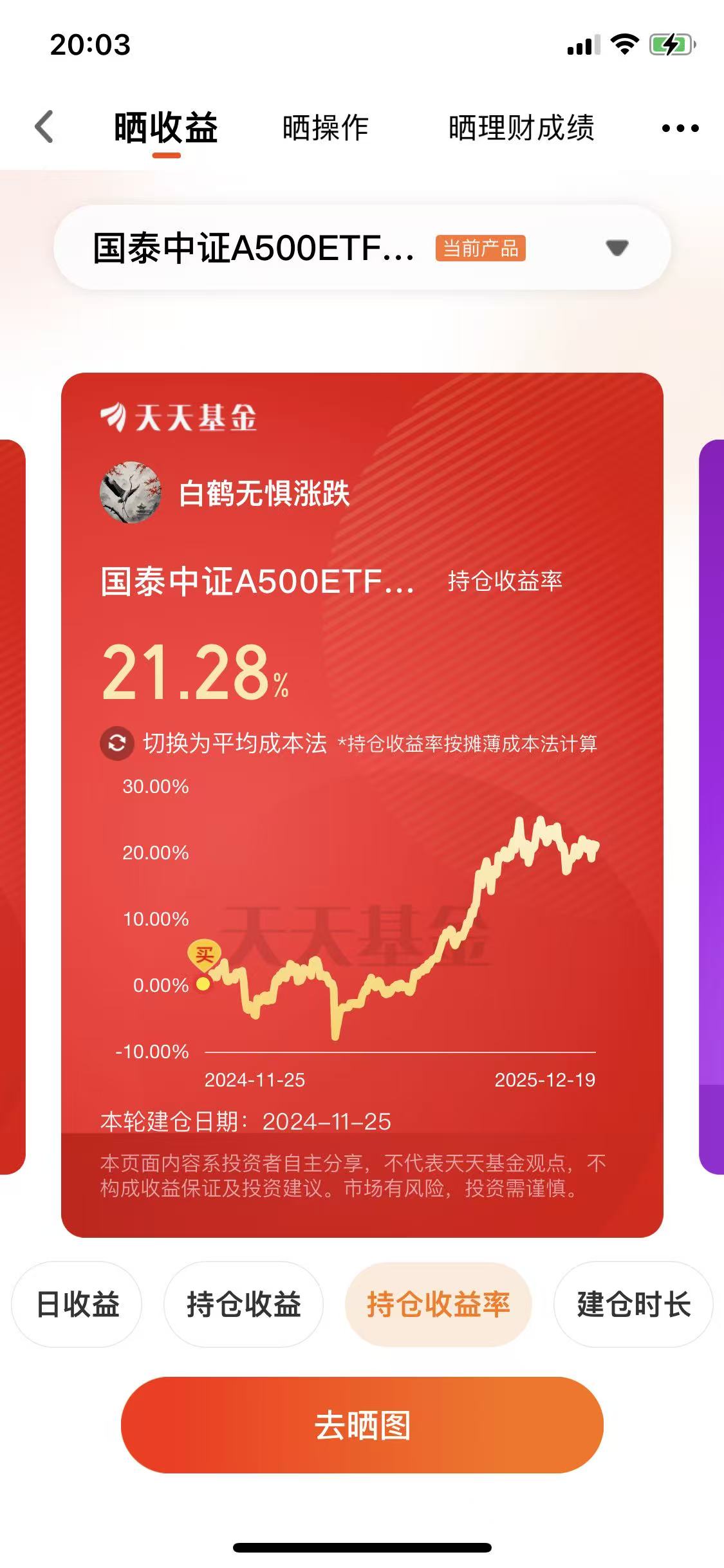 先说说自己的经历吧。白鹤君是在去年11月投资的国泰中证A500ETF发起联接I(022610),到现在刚好一年多的时间,目前持基收益率已经超过了21%,这个成绩放在震荡市中,真的超出了我的预期。其实最让我安心的不是数字,而是在市场波动时,它展现出的那种"稳中有进"的特质。
