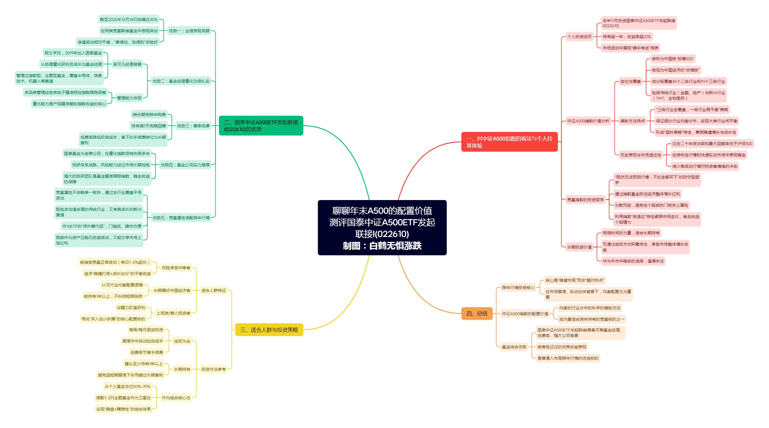 接下来白鹤君就结合自身的持基体验,聊聊对于跨年行情以及中证A500指数的看法,并深度测评下国泰中证A500ETF发起联接I(022610),文章有点长,这里也是做了个思维导图方便大家整理思路,可以点开放大了看下的。