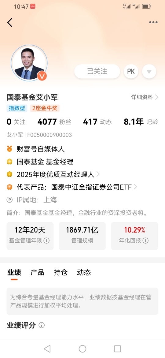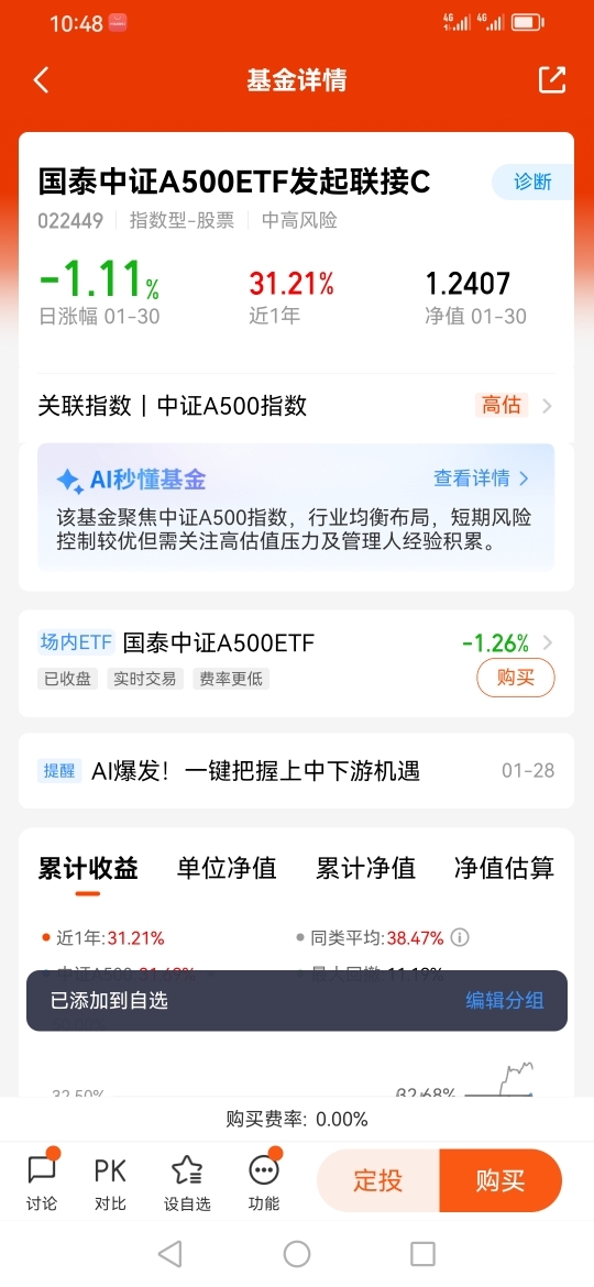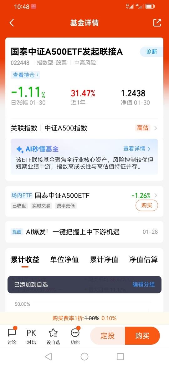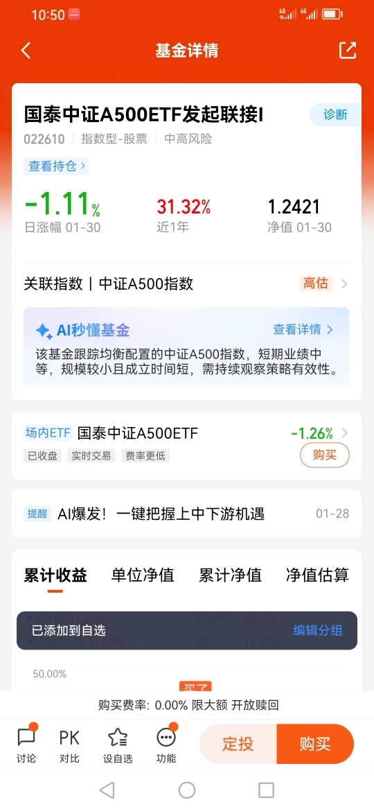 因此我选择了国泰中证A500ETF发起联接I(022610),因为ETF指数基金是被动跟踪指数的,跟踪误差也很小,同时它的指数成分股透明度很高,同时它的管理费用相较于主动型股基,也具备不小的优势,同时它的流动性也很好。在交易方面也是非常的便捷的。而且国泰基金在投资领域也是相当专业的。@国泰基金 @迎接牛市的到来 @基民柳