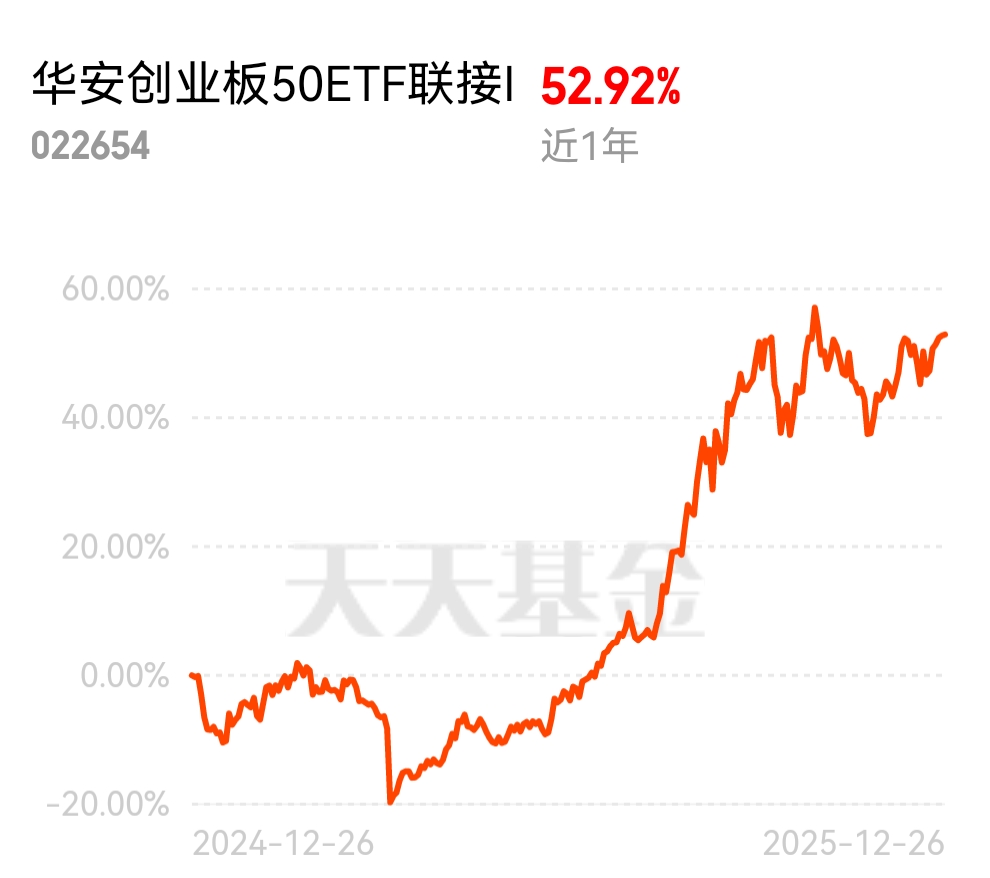 $华安创业板50ETF联接I$ 宽基里 CPO 含量天花板,拿下 6 连涨,年涨 52.92%,费率低 7 天免赎回费进出灵活