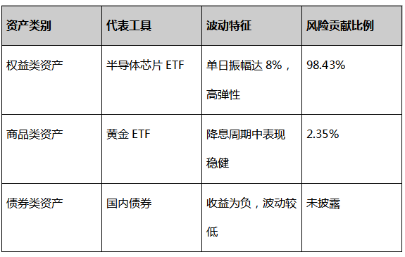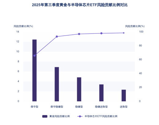 相比之下,黄金ETF在避险需求支撑下表现稳健,2025年三季度金价创近五周新高,且在权益资产下跌时仍保持正收益。实证数据显示,2025年第三季度进取型组合中,权益类资产(如半导体芯片ETF)风险贡献比例高达98.43%,而商品类资产(如黄金ETF)风险贡献比例仅为2.35%。这种极端的风险贡献错配表明,加入黄金ETF能有效对冲科创芯片ETF的极端波动风险。