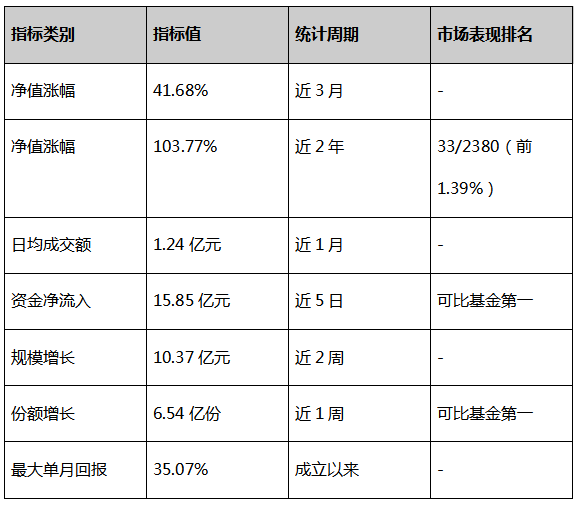 该ETF展现显著弹性特征:近3月上涨41.68%,近2年净值涨幅103.77%,位居股票型基金前1.39%;历史上最长连涨达4个月,涨幅74.17%,上涨月份平均收益率9.90%。资金流向印证配置窗口开启——近5日吸金15.85亿元,近2周规模增10.37亿元,份额增长居可比基金第一。
