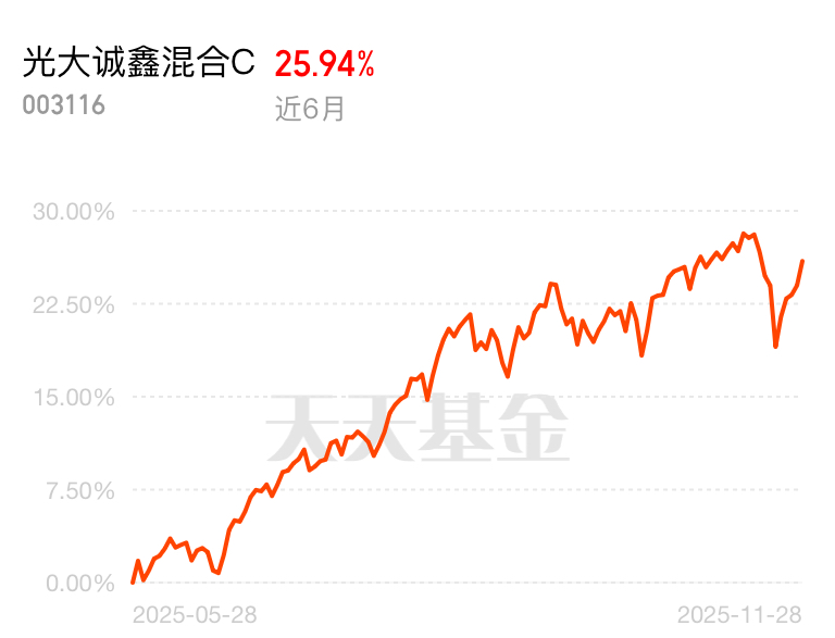智能网联汽车 L3 级车型渗透率快速提升,车规级芯片、域控制器需求暴增,国产化替代加速推进。光大诚鑫混合 C 近 6 个月涨 25.94%,精准踩中这条高景气赛道,持仓标的订单饱满,收益又猛又扎实。