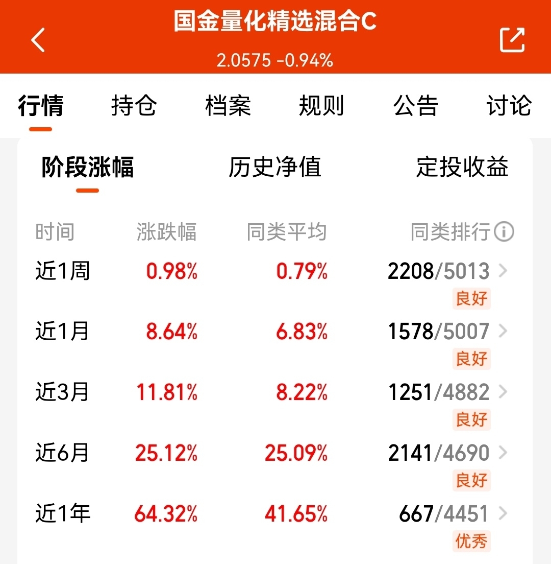 长期还是量化基抗打能力强,$国金量化精选混合C$ 也不限额了,长期短期都是红多绿少,业绩持续性也很强