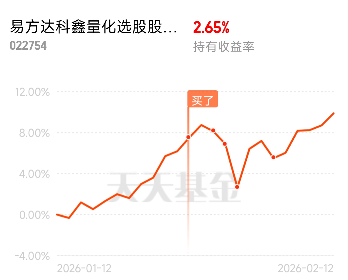 此基发现有点晚了,2025年收益不错,比我持有的两只量化基金收益高出5个百分点。规模只有1亿多,机构持仓超过50%,回撤控制也不错,符合选基标准,前几天调整时果断加仓。
