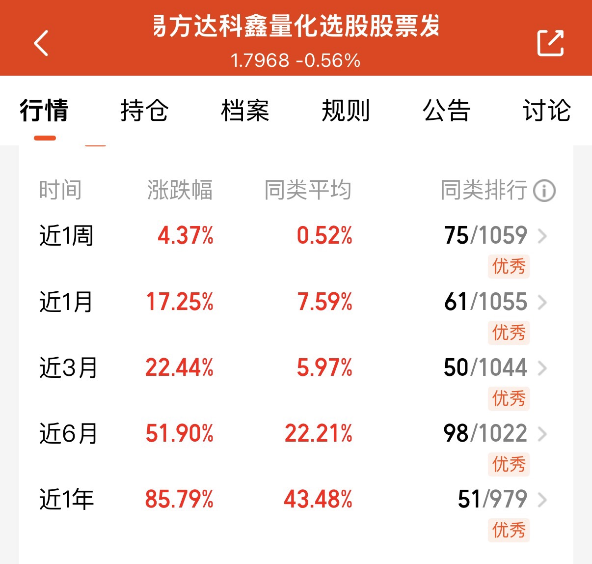 市场这两天轮动的还是挺快的,很多板块也都是出现了回调,目前创业板只拉红,我觉得这波拉红也就靠CPO来撑着场面了,$易方达科鑫量化选股股票发起式C$ 这是基金持仓比较均衡,近一年的业绩也达到85.79%这种基金是量化基,量化超额的收益能力还是很强的,大幅度的跑赢同类产品,我觉得拿着没错了