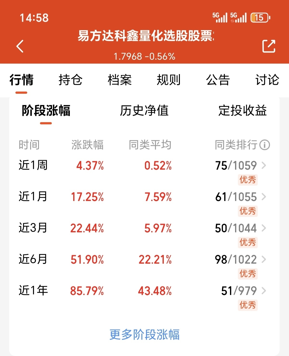 当下板块之间轮动加速,而在波动大的环境中,我觉得还是选择量化产品更加稳定一些,既能跟住牛市趋势,又可平滑整体波动,其中$易方达科鑫量化选股股票发起式C$ 持仓聚焦主动量化策略,收益长期稳定跑赢大盘,近一年涨幅高达85%,同时量化产品可以高频调仓,无需担心行业轮动持续跑赢市场,我准备作为底仓长期持有啦!