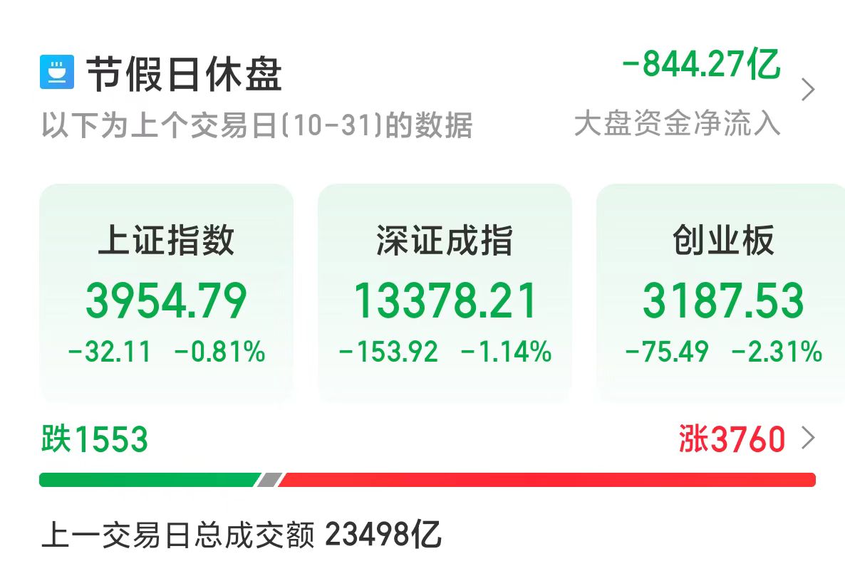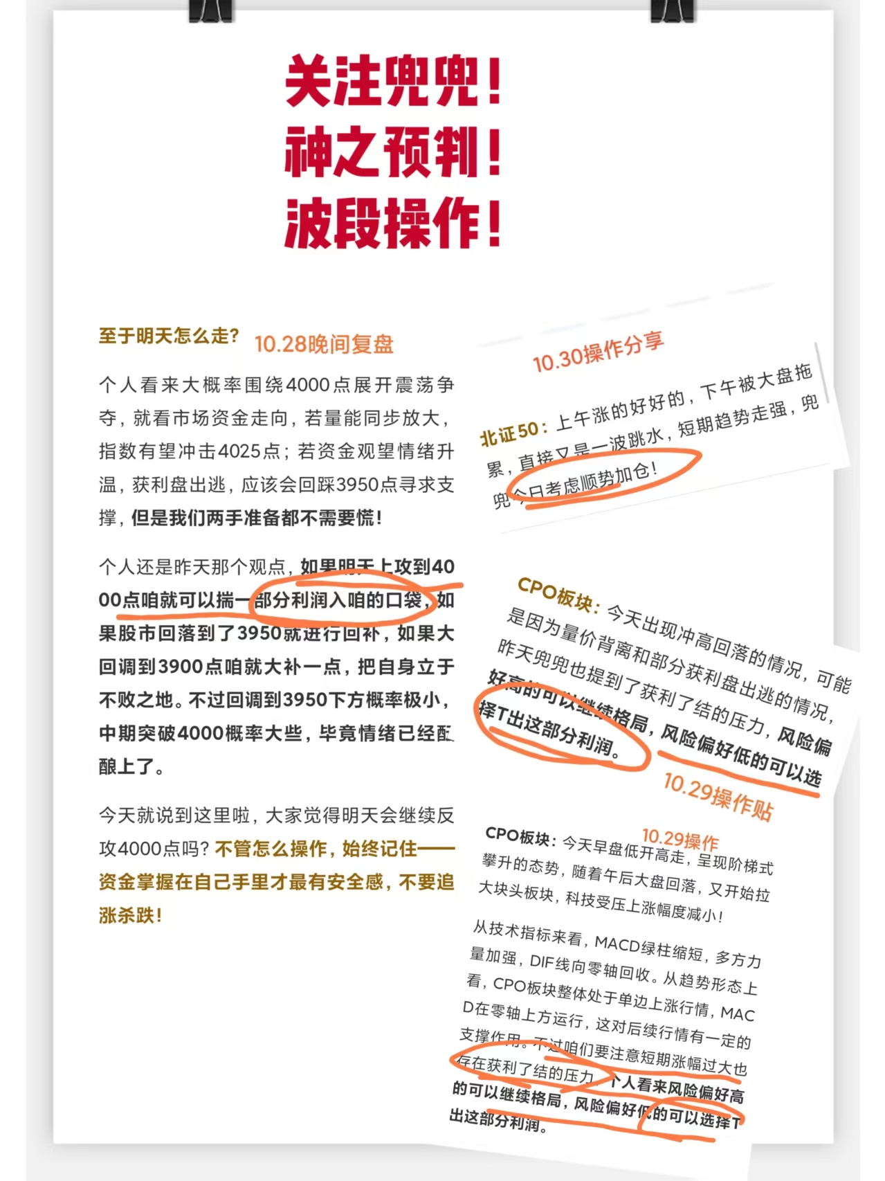 至于明天的行情,兜兜个人觉得大概率依旧是震荡着走或者缩量上涨,上涨过程中的洗牌会有很多,拿得住才是关键!11月第一个交易日又来了,咱们还是按照基本面的逻辑去交易,还是那句话如果按照兜兜复盘T出部分利润,最近应该是喜闻乐见的,我们就按照最坏的打算如果大回调到3900点咱就大补一点,短线操作的话继续观察双创的表现,若能反包继续那好,如果跌破前期低点支撑位,我们就紧急避险一下,短线关注AI应用(传媒游戏)、创新药、电池、机器人;长线则是科技主线地位不变!