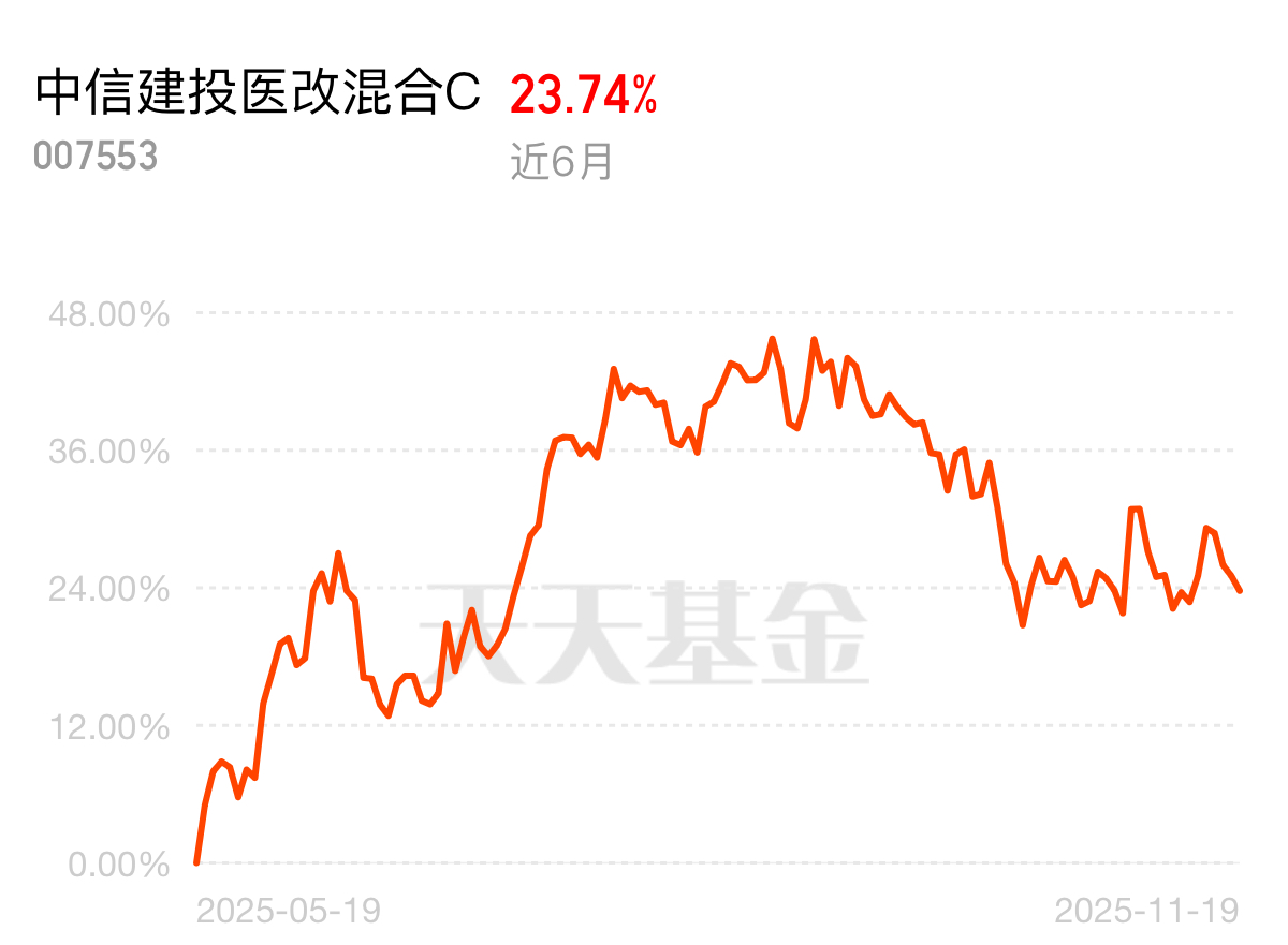 中航优选领航C最近走势一般,我配置了中信建投医改C,近6月涨23%,押中恒瑞、荣昌这些有出海能力的创新药企,更看重A股里真有技术的公司,给组合增加科技医疗属性。
