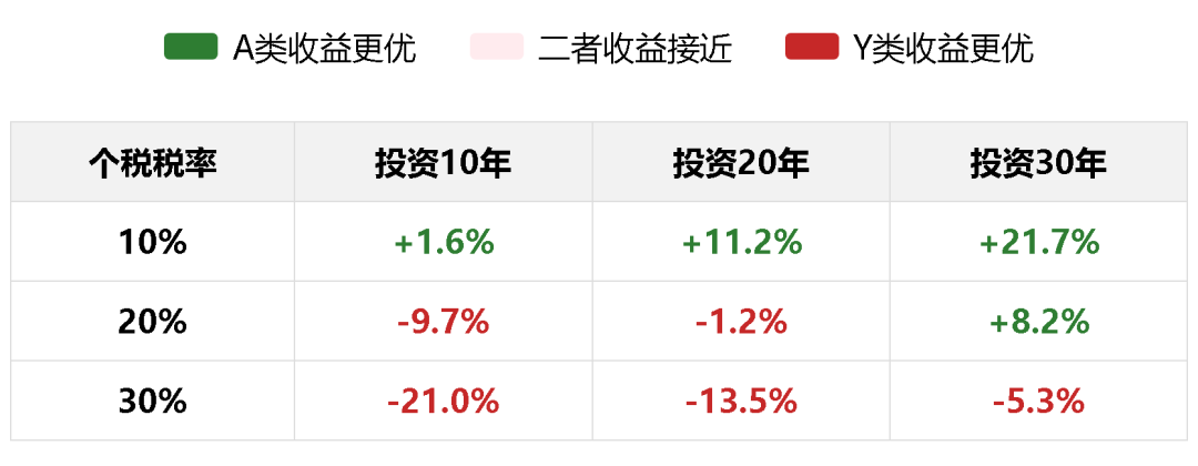 税率 ≤ 20%:仔细想想。如果还能投20年以上(比如你现在45岁),结论和上面差不多,A类占优。如果只剩10-15年了,Y类短期收益优势明显,更稳当。