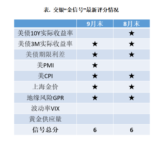 交银投顾最新的黄金投资信号为6分:包括美债3M实际利率、美债期限利差、美国PMI、美国CPI、上海金价格趋势、地缘风险、等6个维度因素继续保持看多。