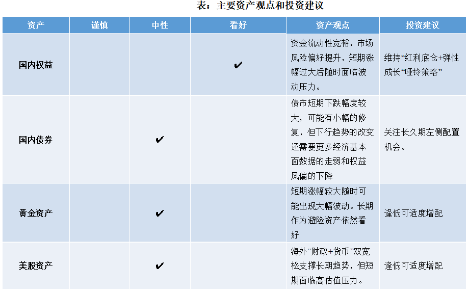 黄金资产:金价短期内涨幅过快,可能随时出现大幅波动,现阶段如有持仓可以继续持有,但短期加仓买入性价比不高。中长期看,经济及地缘政治的不确定性导致的避险需求、美国财政货币双宽格局延续、央行与险资等黄金投资需求增长等因素仍对金价有所支撑,向后展望,仍然建议逢低增配黄金。